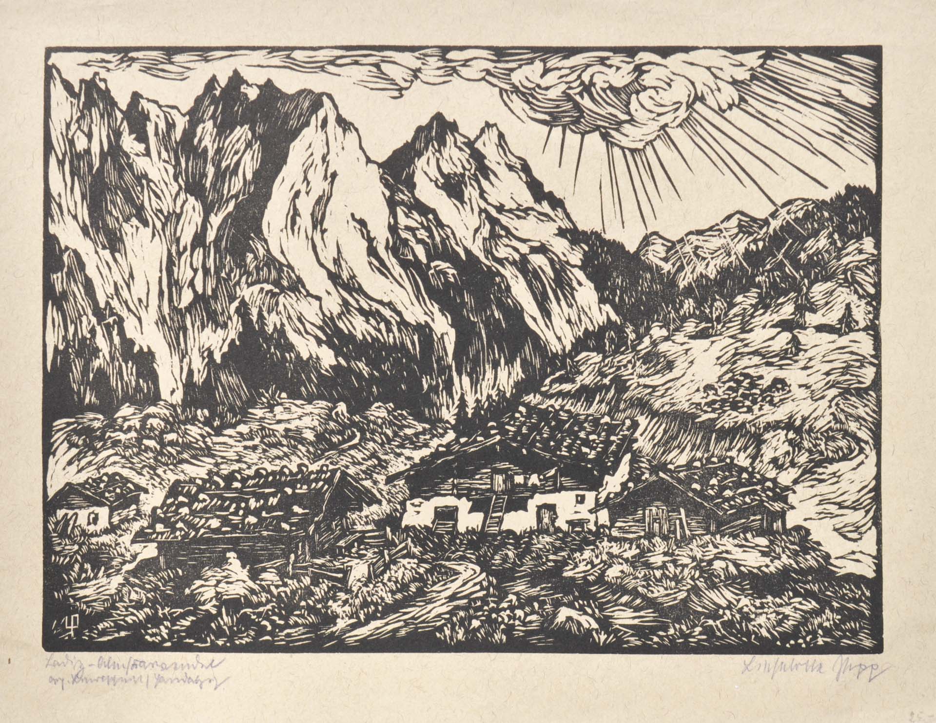 Liselotte Plangger-Popp (Karslfelde, Masuren 1913 – Meran/Merano 2001) Malga in Tirolo;2 Xilografie, 17 x 22,7 cm o 20,2 x 27,7 cm