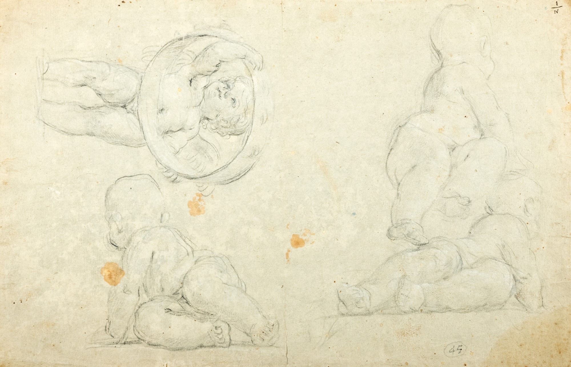 Attribuito a Carlo Cignani (Bologna 1628-Forlì 1719) - Studi di putti (recto); e Studi di braccia, viso e panneggio (verso)