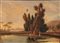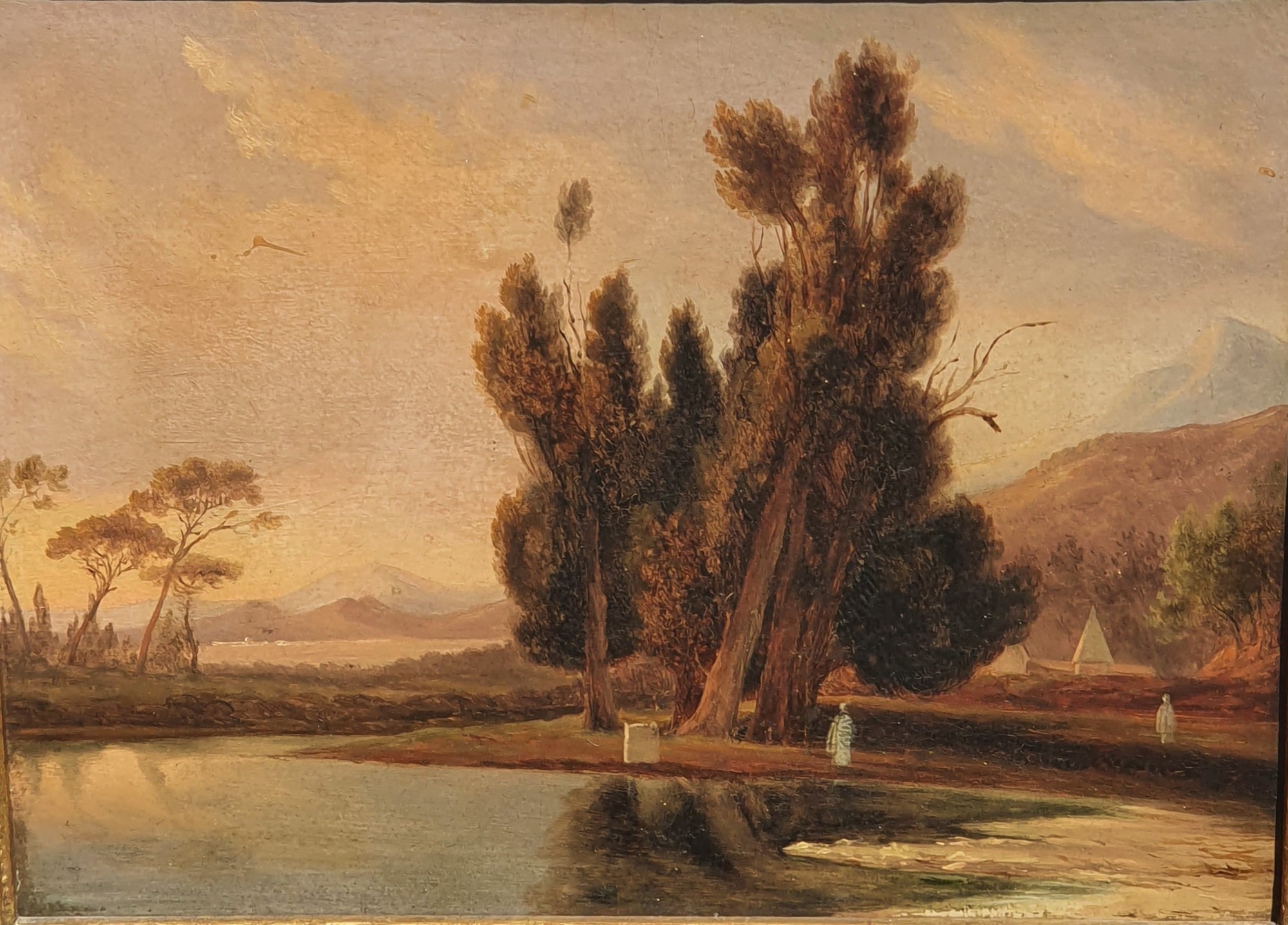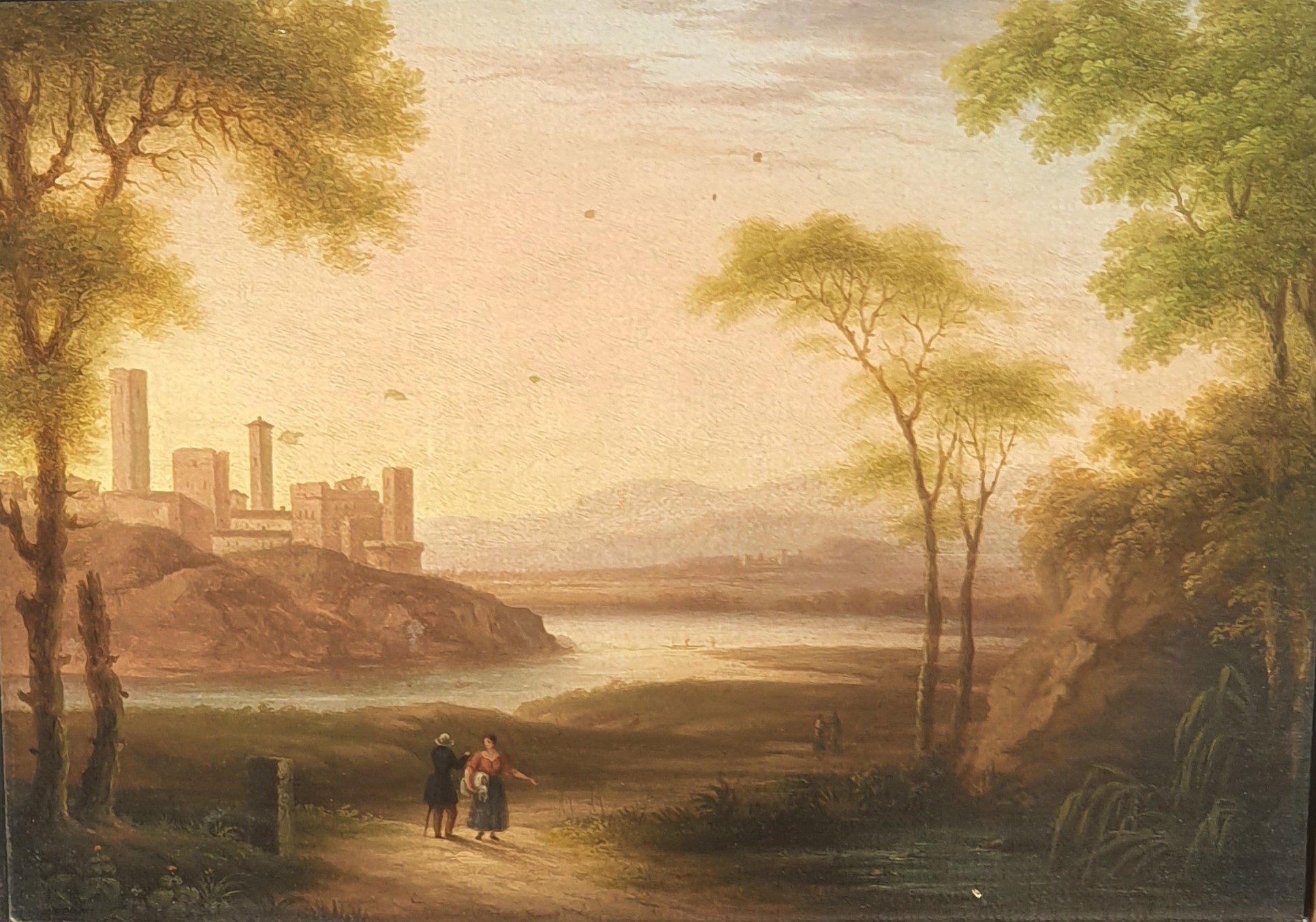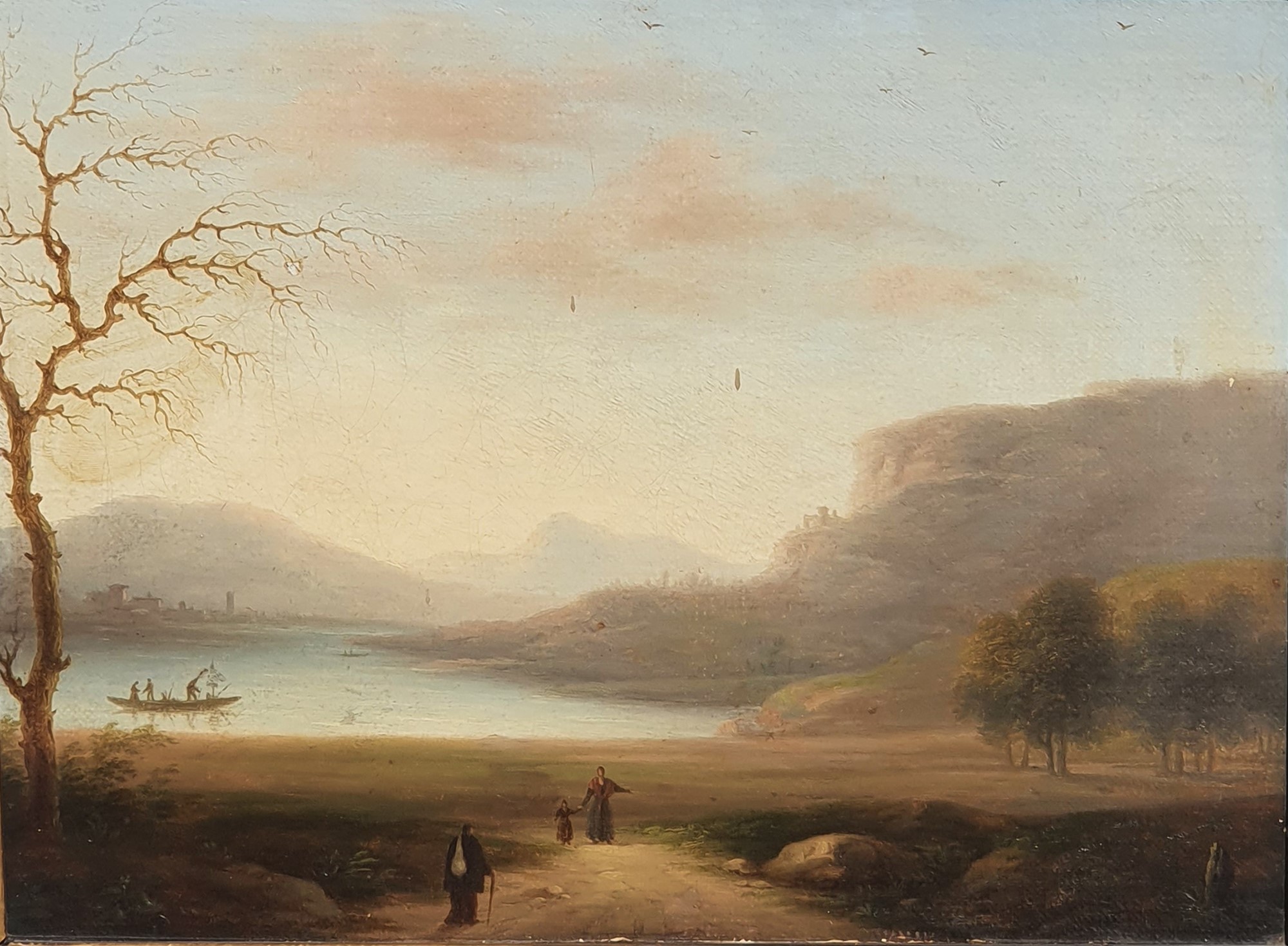 Scuola europea, inizi del XIX secolo - Lotto di tre dipinti raffiguranti paesaggi fluviali con astanti
