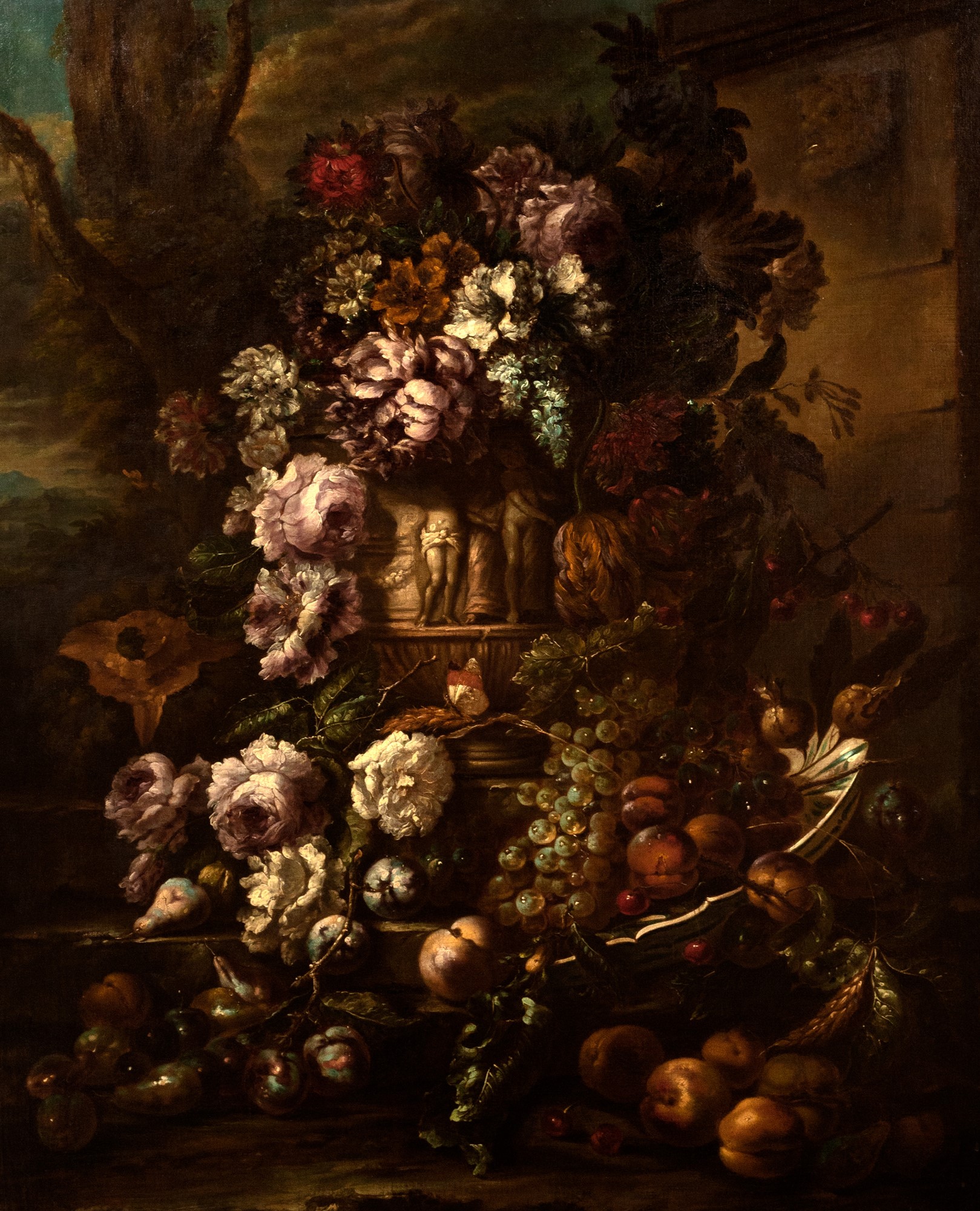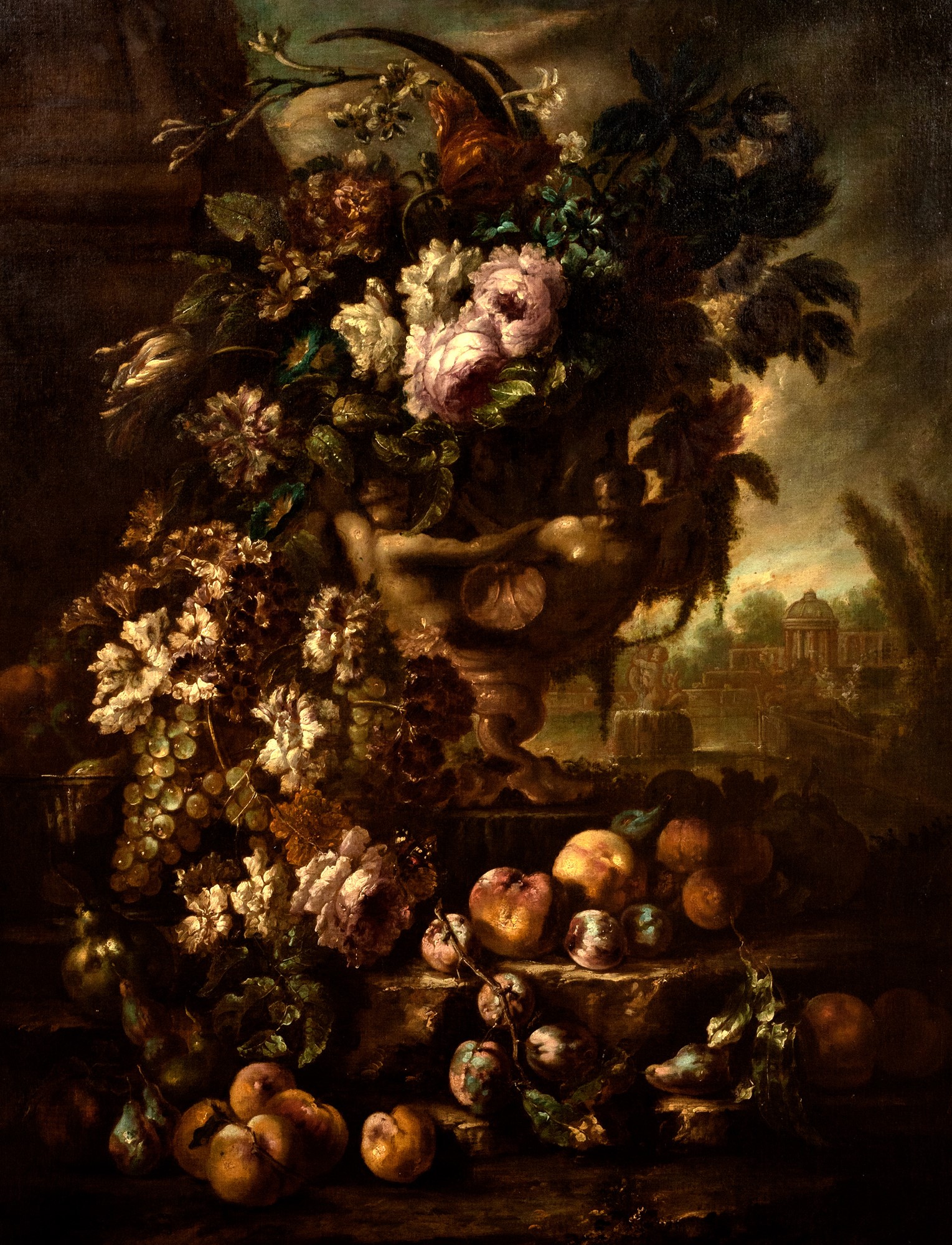 Scuola romana, seconda metà del secolo XVII - Due trionfi di fiori in vasi istoriati en plein air