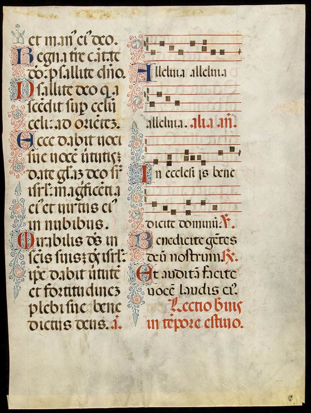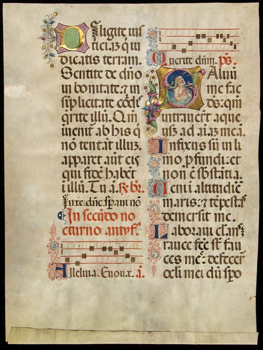 Questo foglio unico da antifonario reca al recto, all'interno dell'iniziale S, l'immagine miniata raffigurante un uomo barbuto e coronato che emerge ignudo e in preghiera dalle acque che potrebbe rappresentare l'anima persa di cui parla il salmo ivi trascritto. La miniatura nella lettera S può essere riferita a Giovvanni Pietro da Birago sulla base dei confronti stilistici con alcune miniature contenute nelle opere a lui attribuite con maggiore consenso degli studiosi, quali quelle della Sforziada, di Giovanni Simonetta, o delle Vite dei Re di Francia, di Alberto Cattaneo.