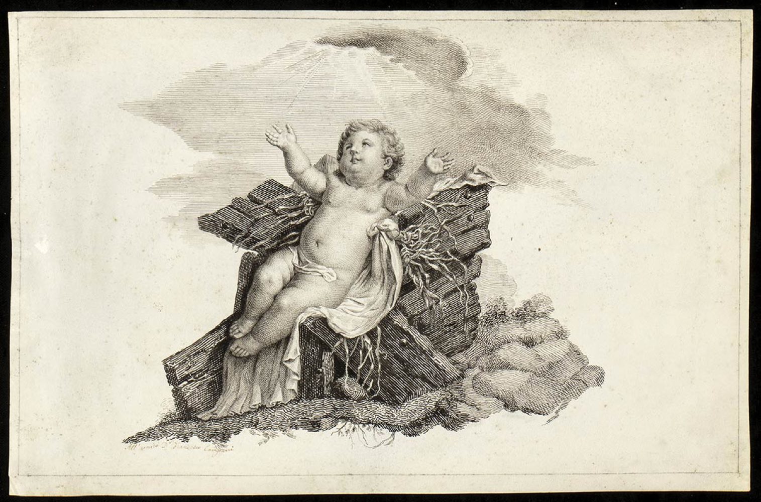 Il disegno reca in basso al margine della culla la dedica: "ALL'AMICO DR FRANCESCO CAMPANI".
