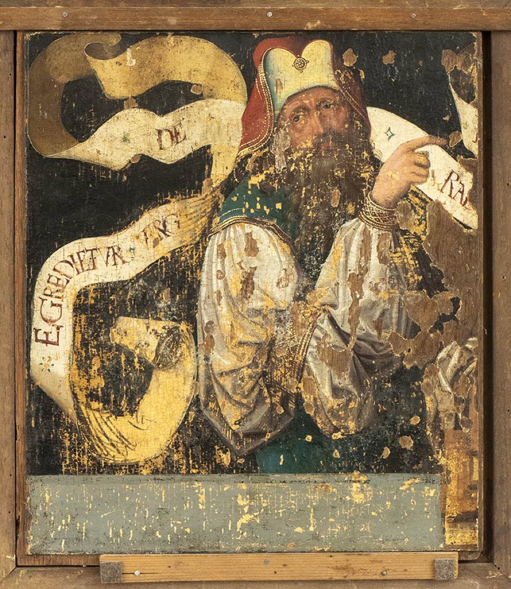 La figura al retro è riconoscibile come il profeta Isaia grazie al rotolo che lo accompagna, sul quale si può leggere l'iscrizione: "EGREDIETUR VIRG[A] / DE (…) RA[DICE JESSE]" (Isaia 11, 1).