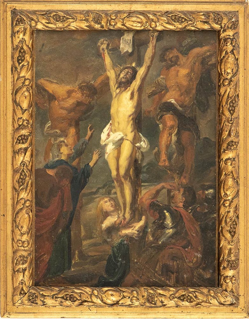 Il piccolo dipinto costituisce una replica fedele, eseguita con particolare scioltezza di tocco, del dipinto di Rubens eseguito intorno al 1635 per l'altare maggiore della chiesa dei Cappuccini di Anversa e oggi nel musée des Augustins de Toulouse.