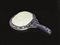 Placca, Cina sec. XIX-XX, in giada montata sul retro di uno specchio in metallo smaltato, la giada di un verde pallido dalla forma leggermente polilobata, raffigurante saggi in un paesaggio, dimensioni placca cm 14x12, specchio lung. cm 31, manico danneggiato