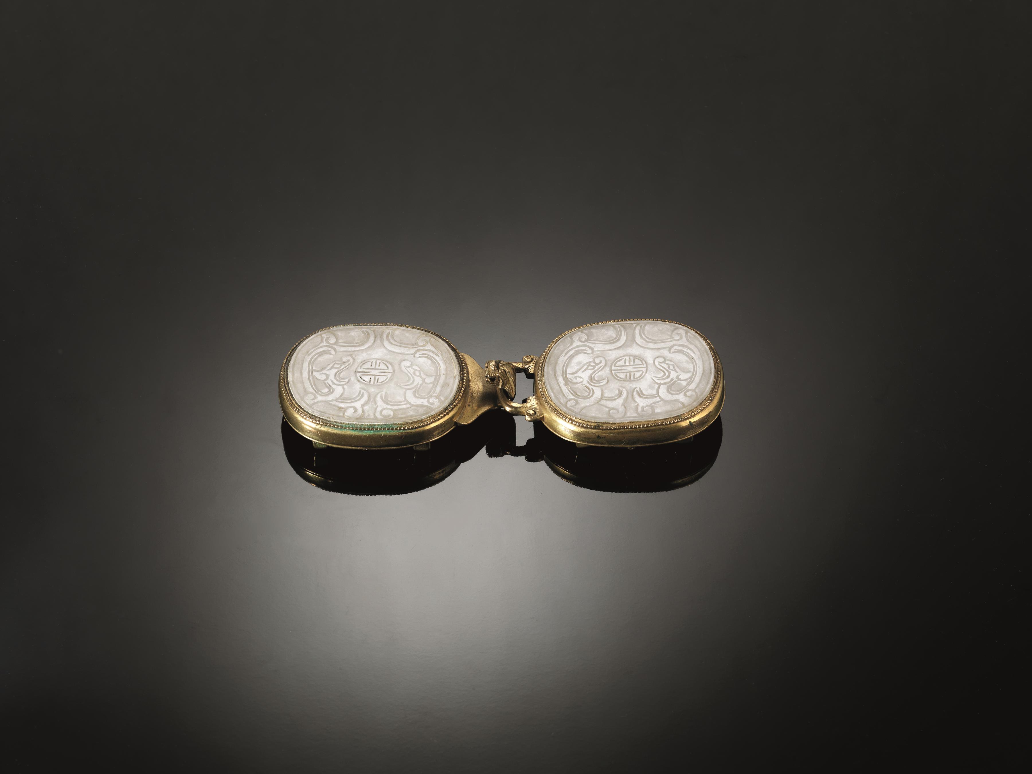 Fibbia, Cina sec. XIX, formata da una montatura in bronzo dorato e cesellato con motivi floreali nella parte sottostante, sulla quale sono applicate due placche in giada vere pallido decorate con motivi geometrici, lung. cm 14,5