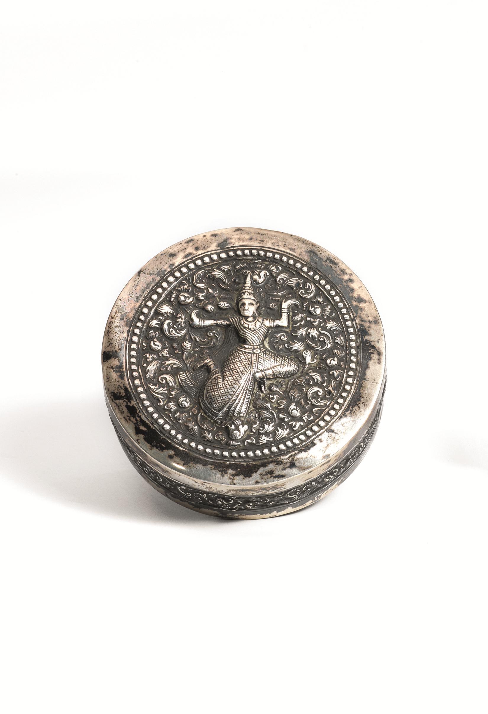 Contenitore, India, sec. XIX, di forma circolare in argento sbalzato il coperchio decorato con divinità danzante al centro, diam. cm 10