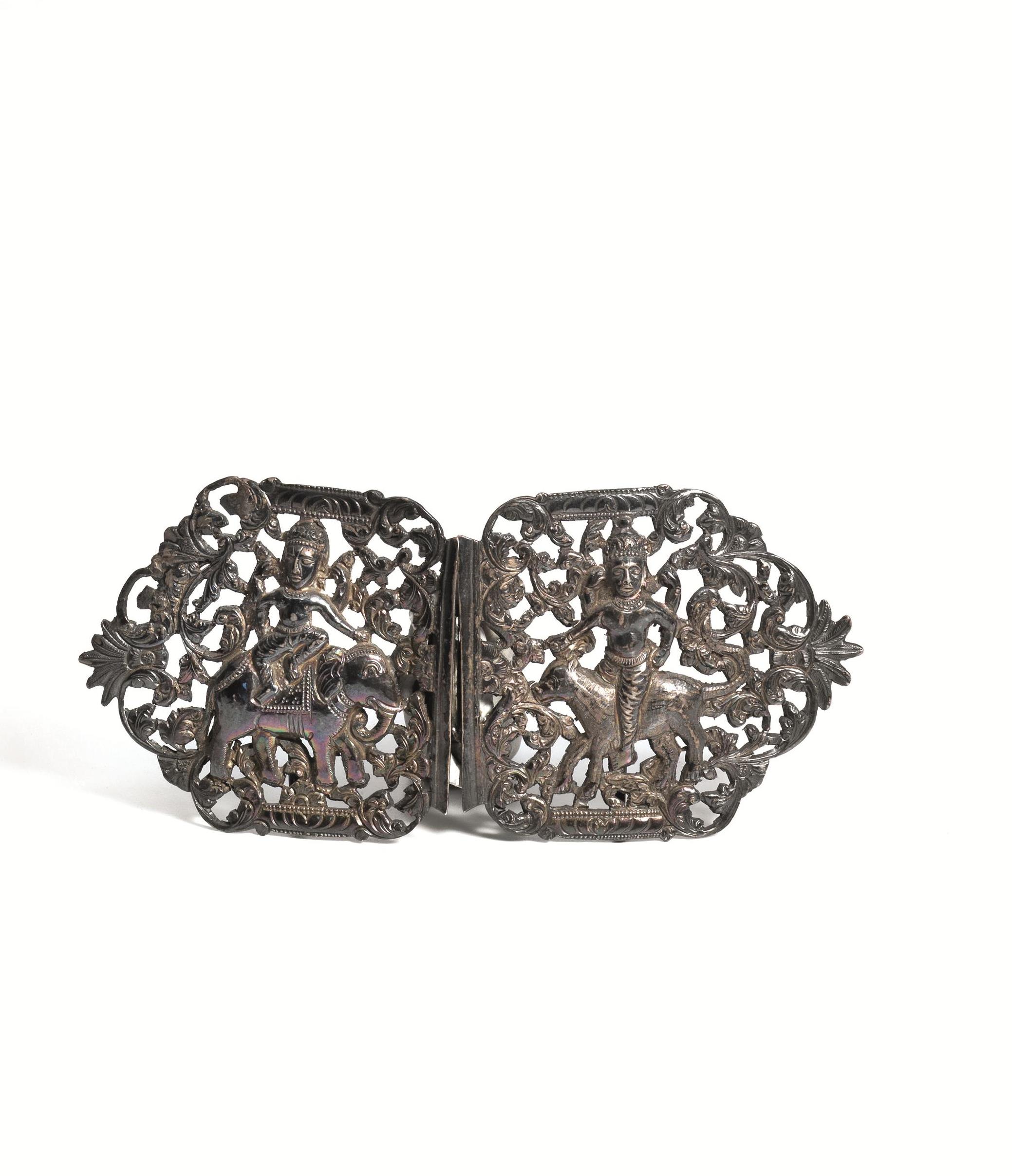 Fibbia, India, sec. XIX, in argento decorata al traforo con raffigurate due divinità, lung. cm 13, lievi danni