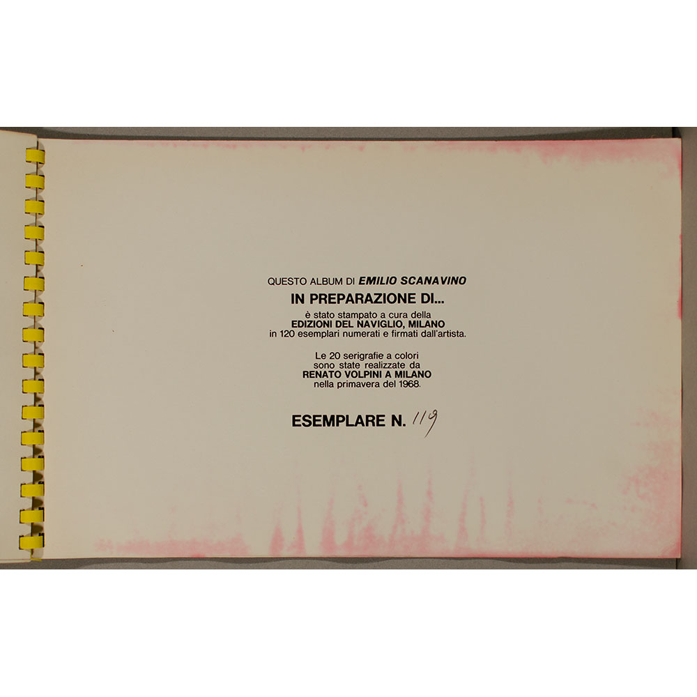 album di 20 serigrafie a colori, ed. 119 su una tiratura complessiva di 120 esemplari realizzate da Renato Volpini e stampate a cura delle Edizioni del Naviglio, Milano. Dimensioni: cm 23,5x35,5. Ciascun foglio è firmato dall’artista.