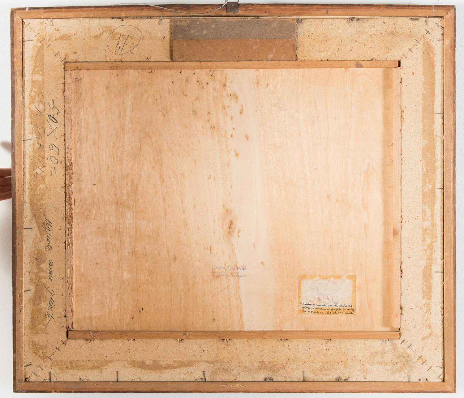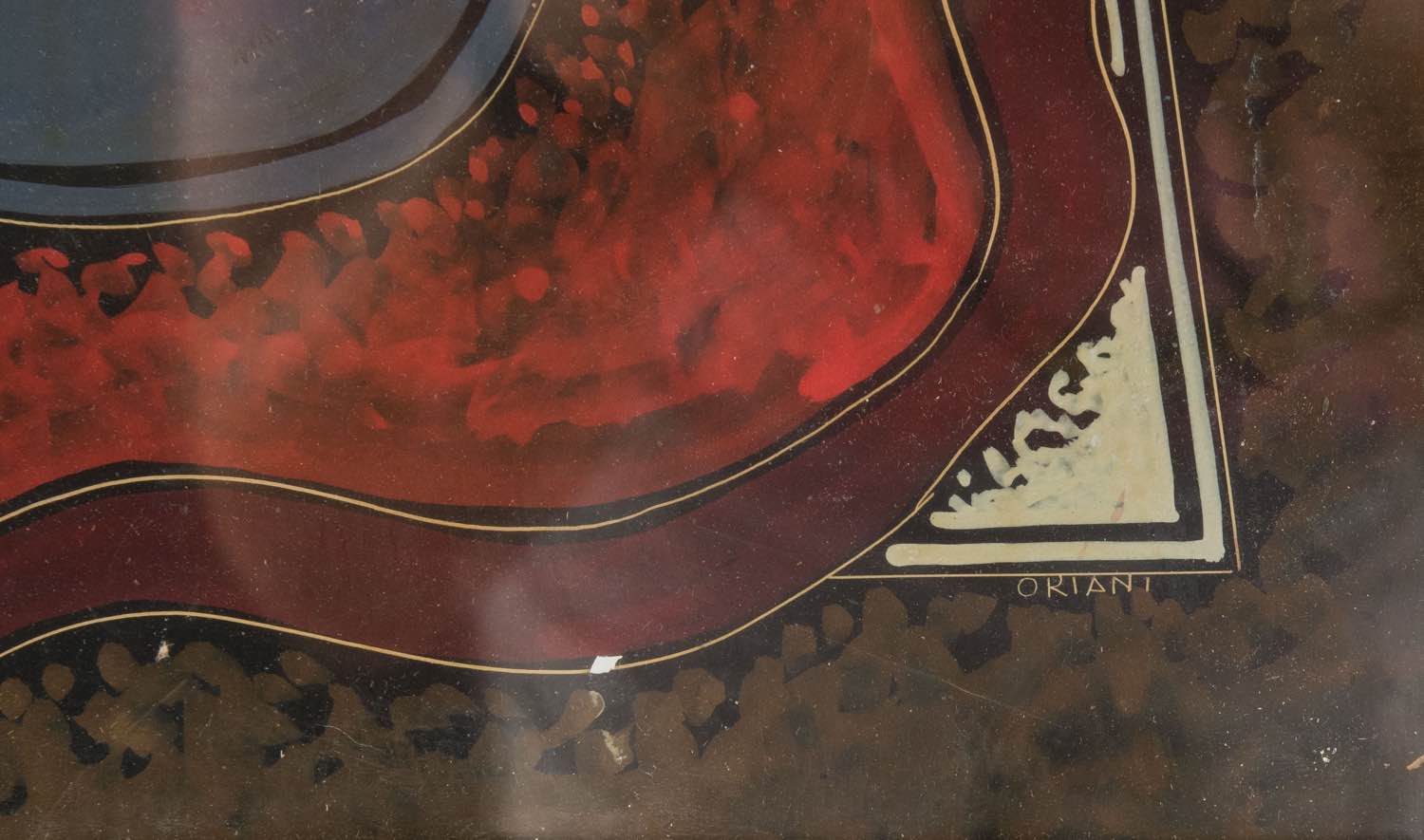 Encausto - graffito su cartone gessato, firmato in basso a destra Oriani, reca titolo ‘Natura morta con carte da gioco’, tecnica e misure al retro, H cm 50x60 Al retro reca timbro per autentica con firma Pippo Oriani e n. 141.