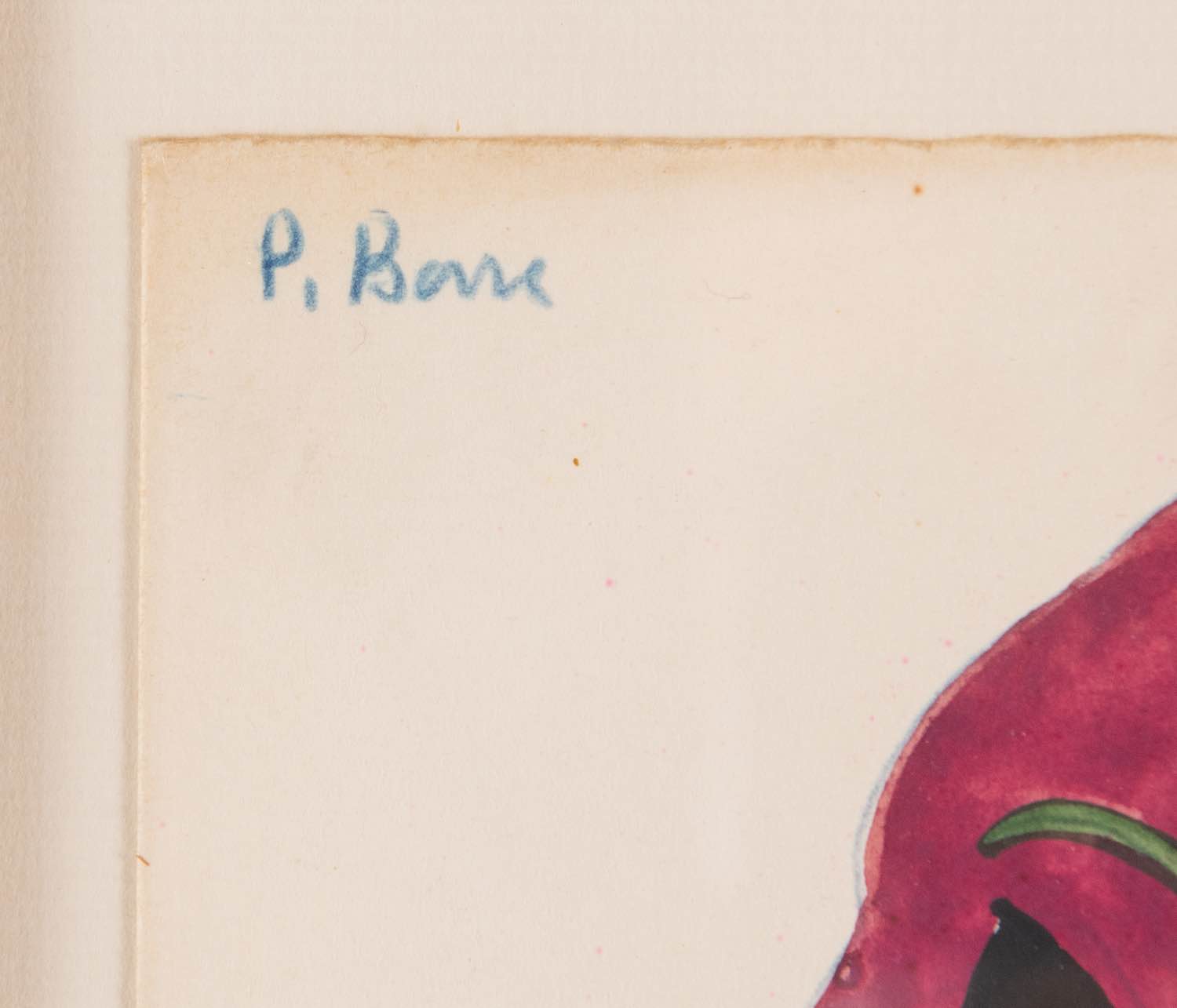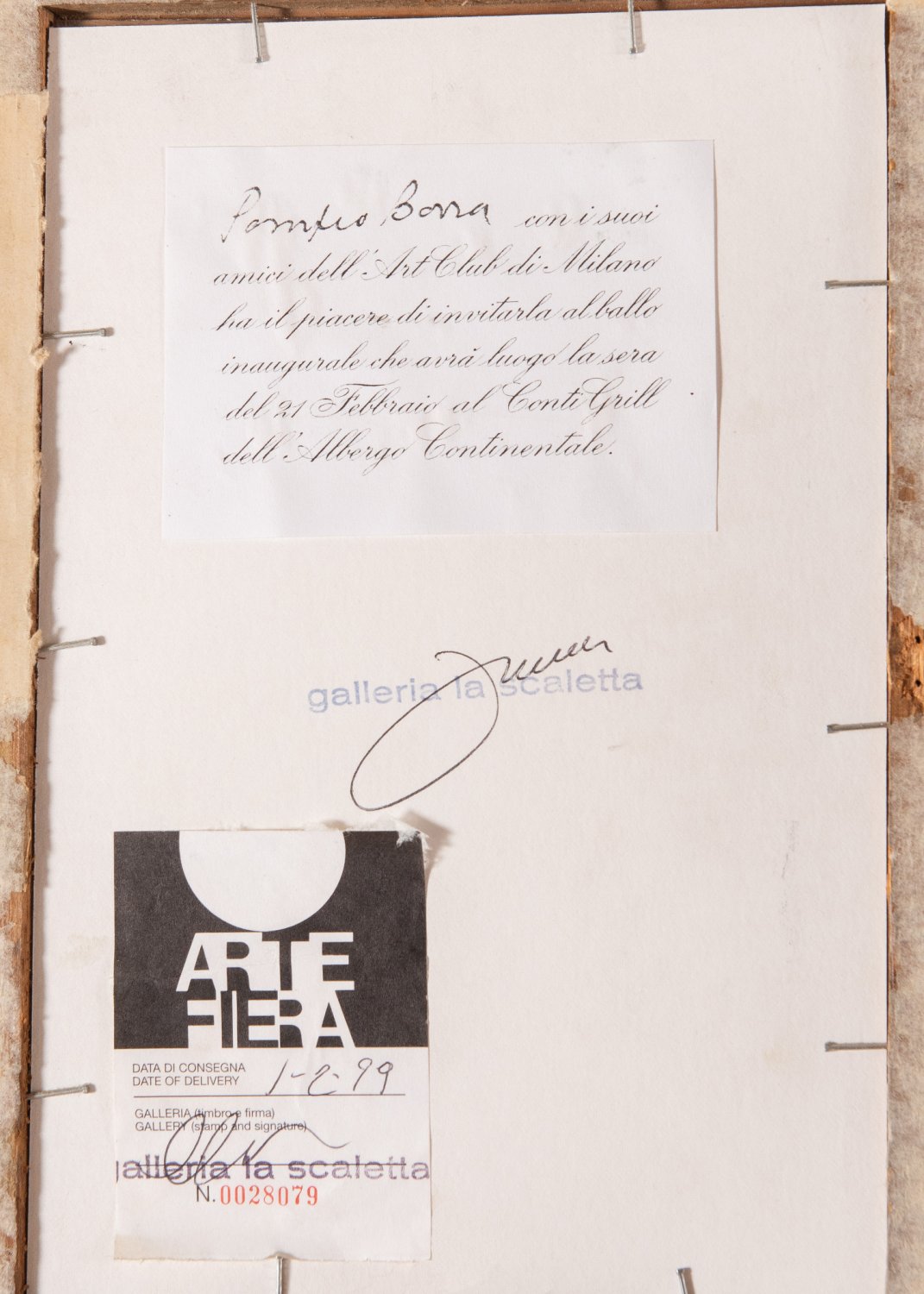 Tecnica mista su carta, firmato in alto a sinistra P. Borra, H cm 16x11.5 Al retro reca timbro e firma Galleria La Scaletta, etichetta Arte Fiera con data 1-2-99. Invito originale dell’Art Club per l’inaugurazione a Milan, al retro dell’opera testo dell’invito. Opera accompagnata da certificato di autenticità su fotografia a firma del nipote in data 28/01/1999.