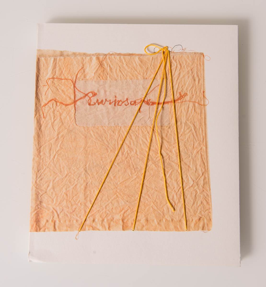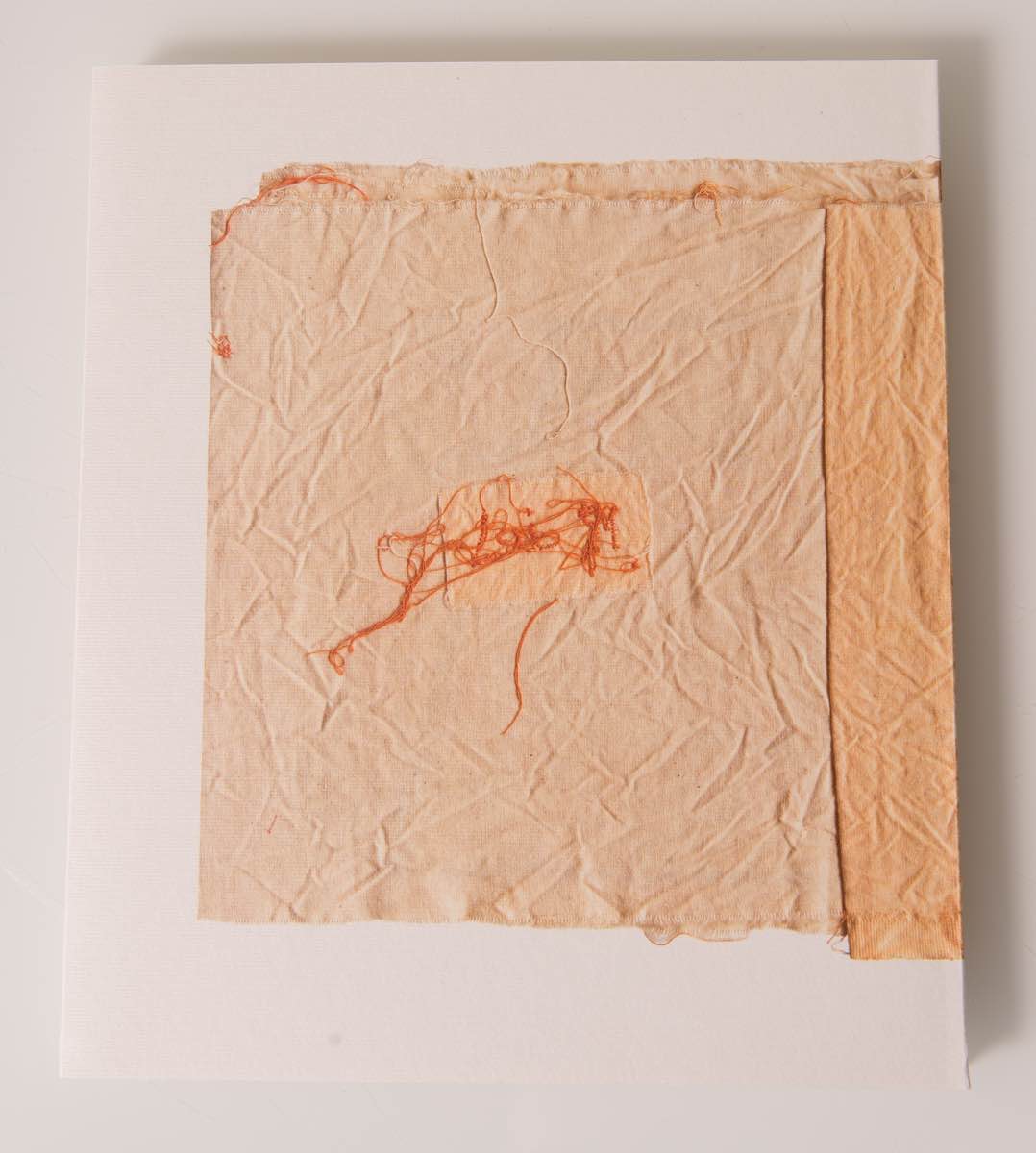 Applicazione di fili di cotone sulla copertina del libro ‘Maria Lai, Curiosape’, testo di Maria Lai & Gianni Murtas, Ed. Arte Duchamp Cagliari, H cm 28x24x1.5