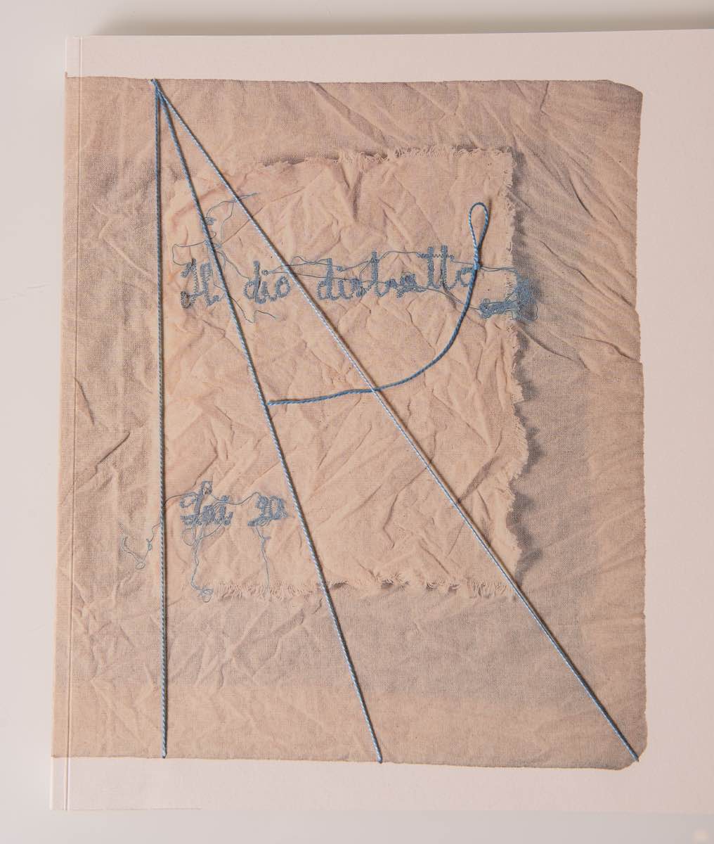 Applicazione di fili di cotone sulla copertina del libro ‘Il Dio distratto - Maria Lai’, interpretazione per immagini di un racconto di Giuseppe Dessì, testo di Maria Lai, Ed. Arte Duchamp Cagliari, H cm 32x28x2