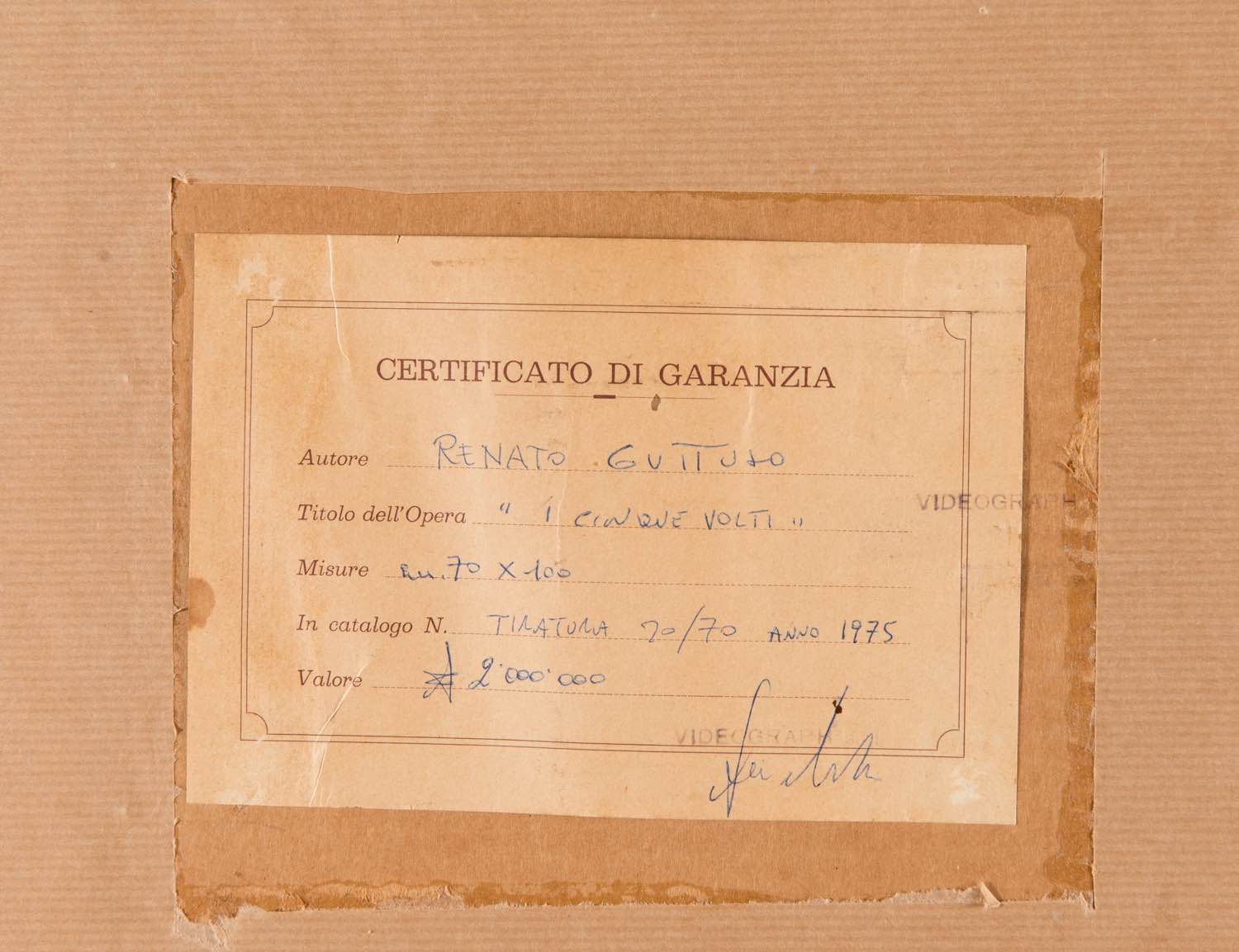 Litografia a due colori su carta, firmata in basso a destra Guttuso, numero di tiratura in basso a sinistra 20/70, stampatore ed editore Astrid - Varese, Lastra H cm 59x79, Foglio H cm 70x100 Al retro reca Certificato di Garanzia con data 1975. Bibliografia di riferimento: Cat. n. 2 Bolaffi, 1970-71 n. 95586; “Notizie d’Arte 1971”, 2, p.7; Prandi 154, 355; “Guttuso - Opera Grafica” Paolo Bellini - Club Amici dell’Arte Editore, 1978, p. 73, n. 117.