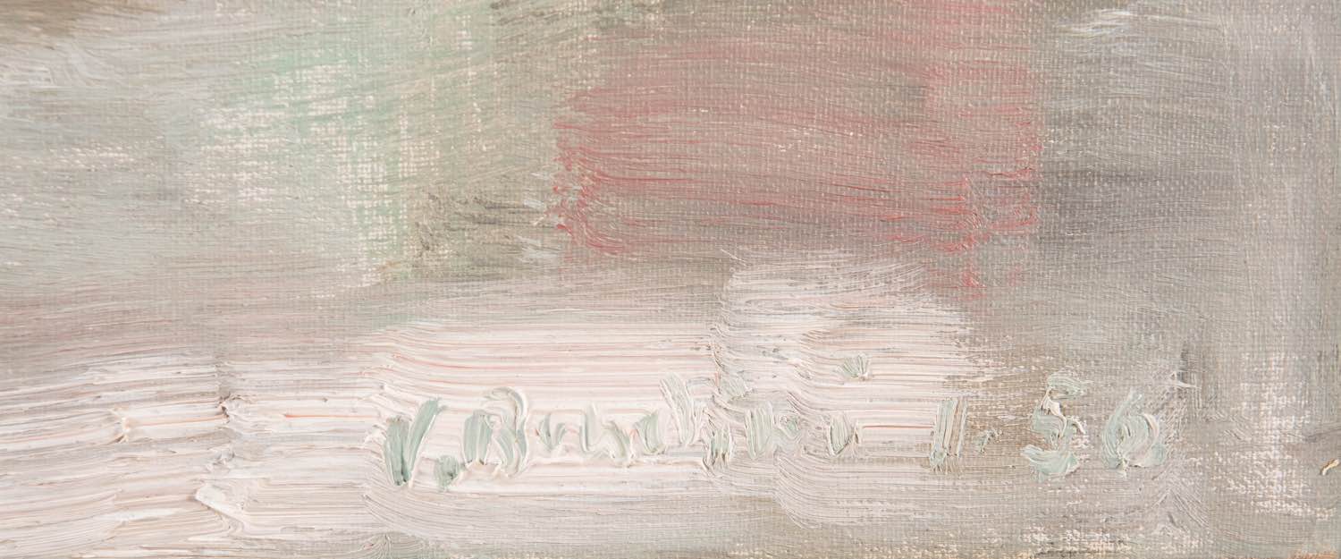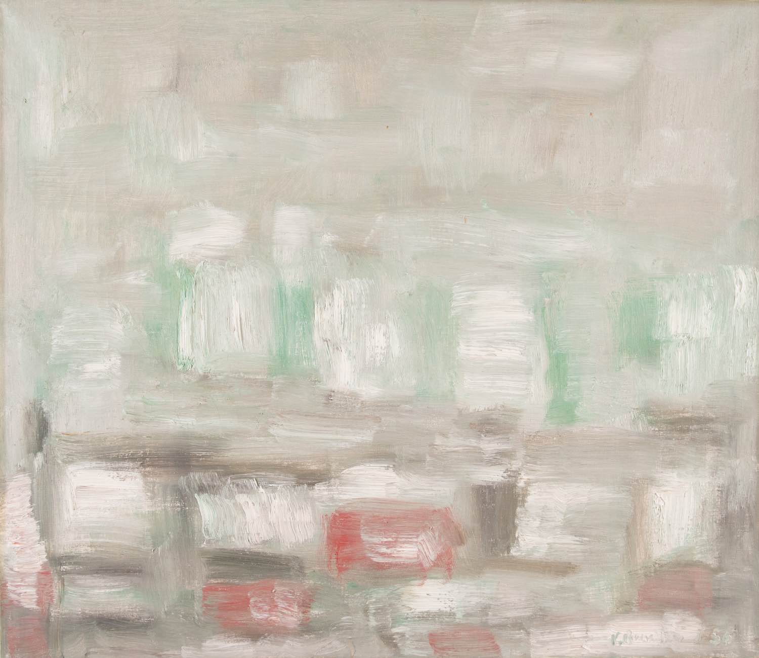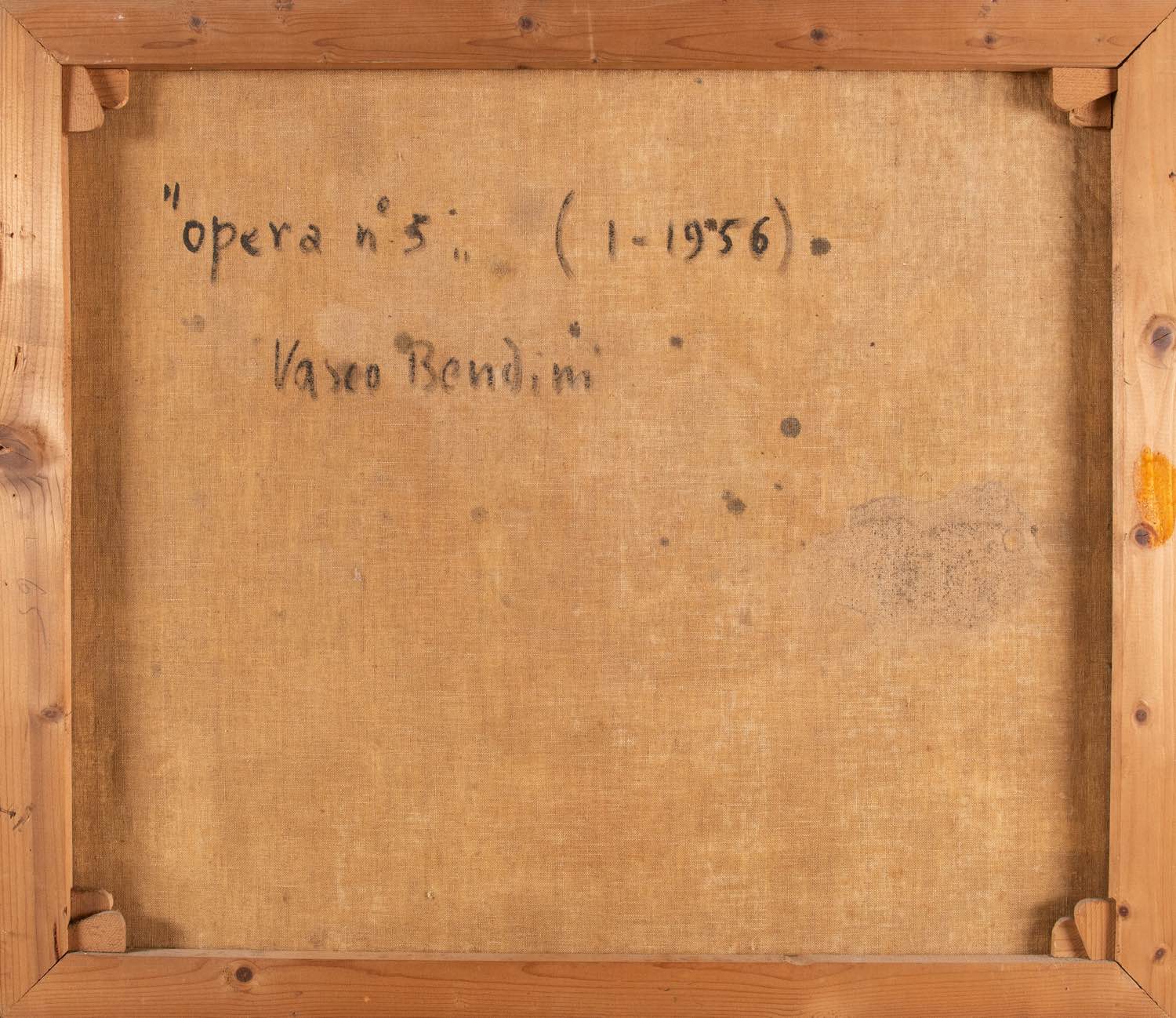 Olio su tela, firmato e datato in basso a destra V. Bendini I-56, al retro reca titolo, data e firma ‘opera n° 5 (I-1956)/Vasco Bendini’, H cm 66x75