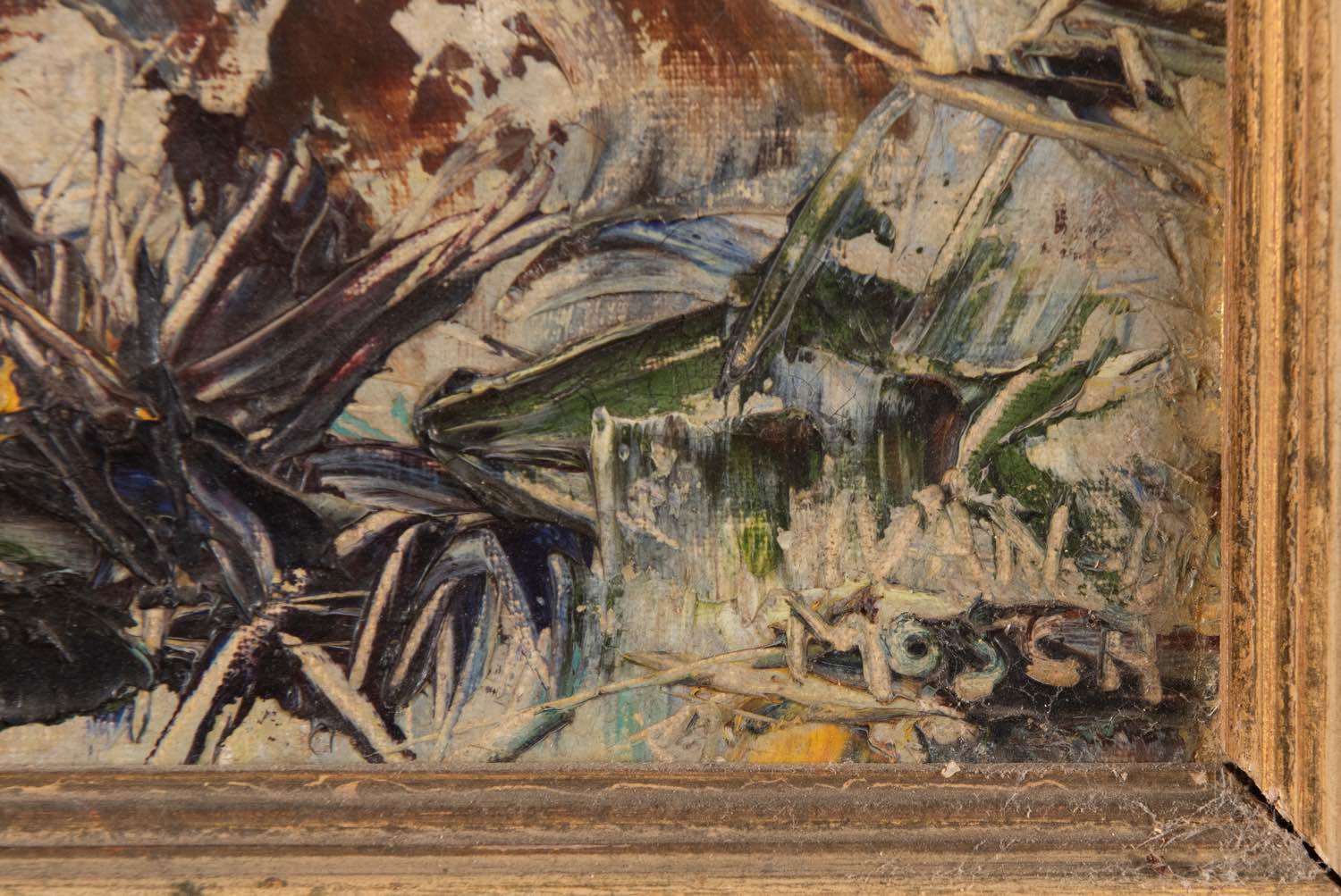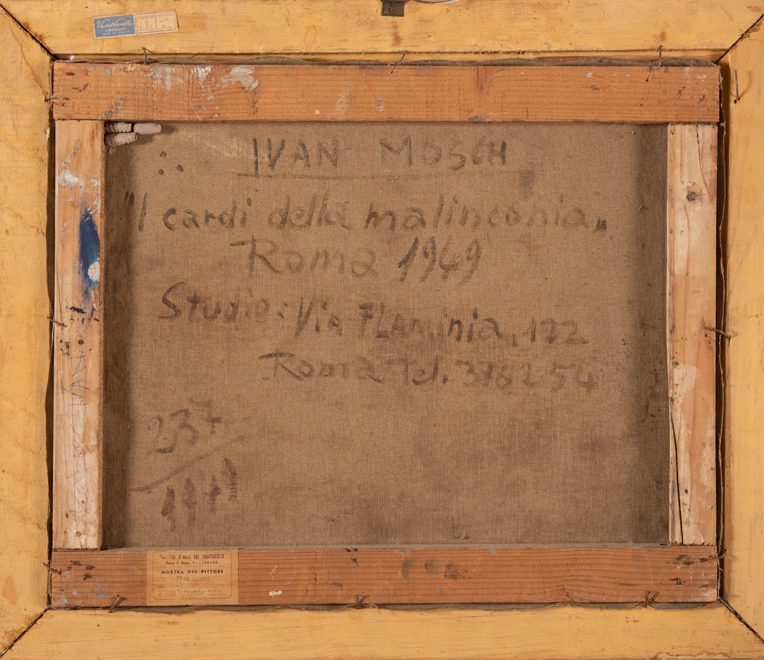 Olio su tela firmato e datato in basso a destra Ivan Mosca 1949, al retro reca iscrizione ‘Ivan Mosca/I cardi della malinconia/Roma 1949’ e numero 237/1949, H cm 40x49.5 Al retro reca etichetta Galleria d’arte Il Grattacielo - Legnano, Mostra del pittore Ivan Mosca dal 15 al 23 Aprile 1951.