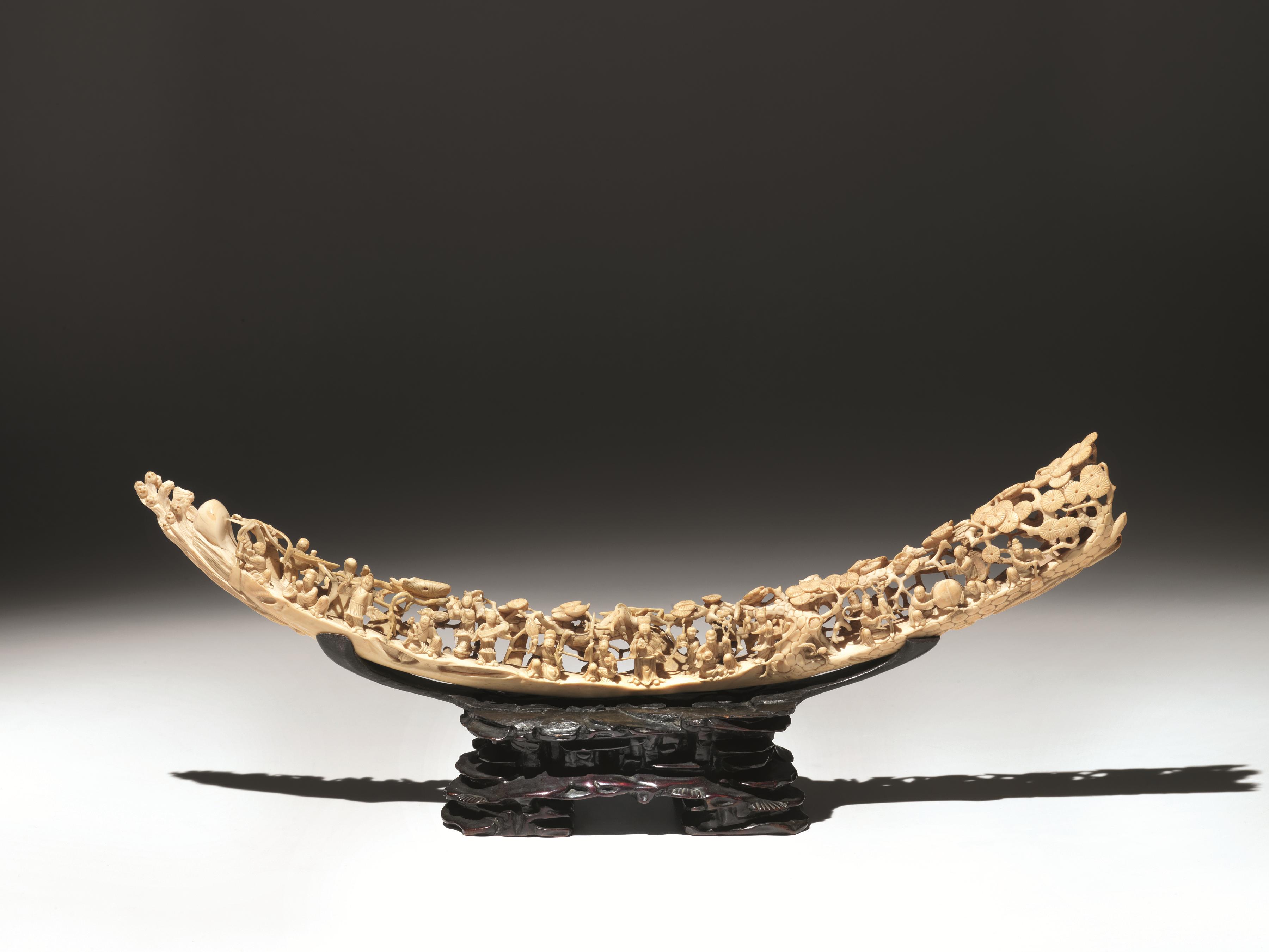 Zanna, Cina sec. XVIII-XIX, in avorio finemente decorata al traforo con personaggi intenti nel proprio lavoro sotto l'ombra di un grande albero di lingzhi, lung. cm 51, su base in legno intagliata a forma di roccia, alt. cm 6
