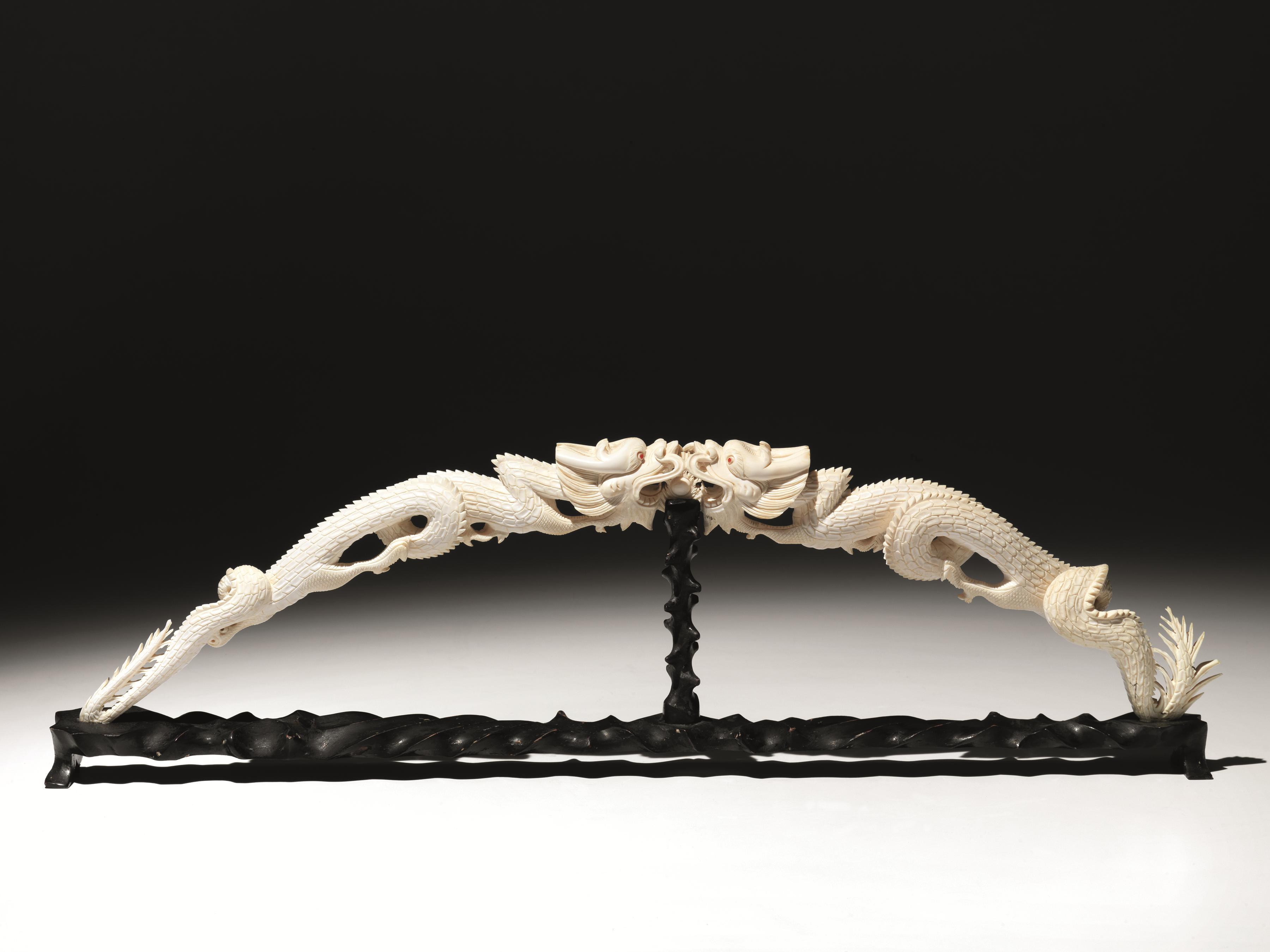 Intaglio Cina sec. XX, in avorio raffigurante coppia di draghi che si affrontano, lung. cm 62, su base in legno.