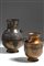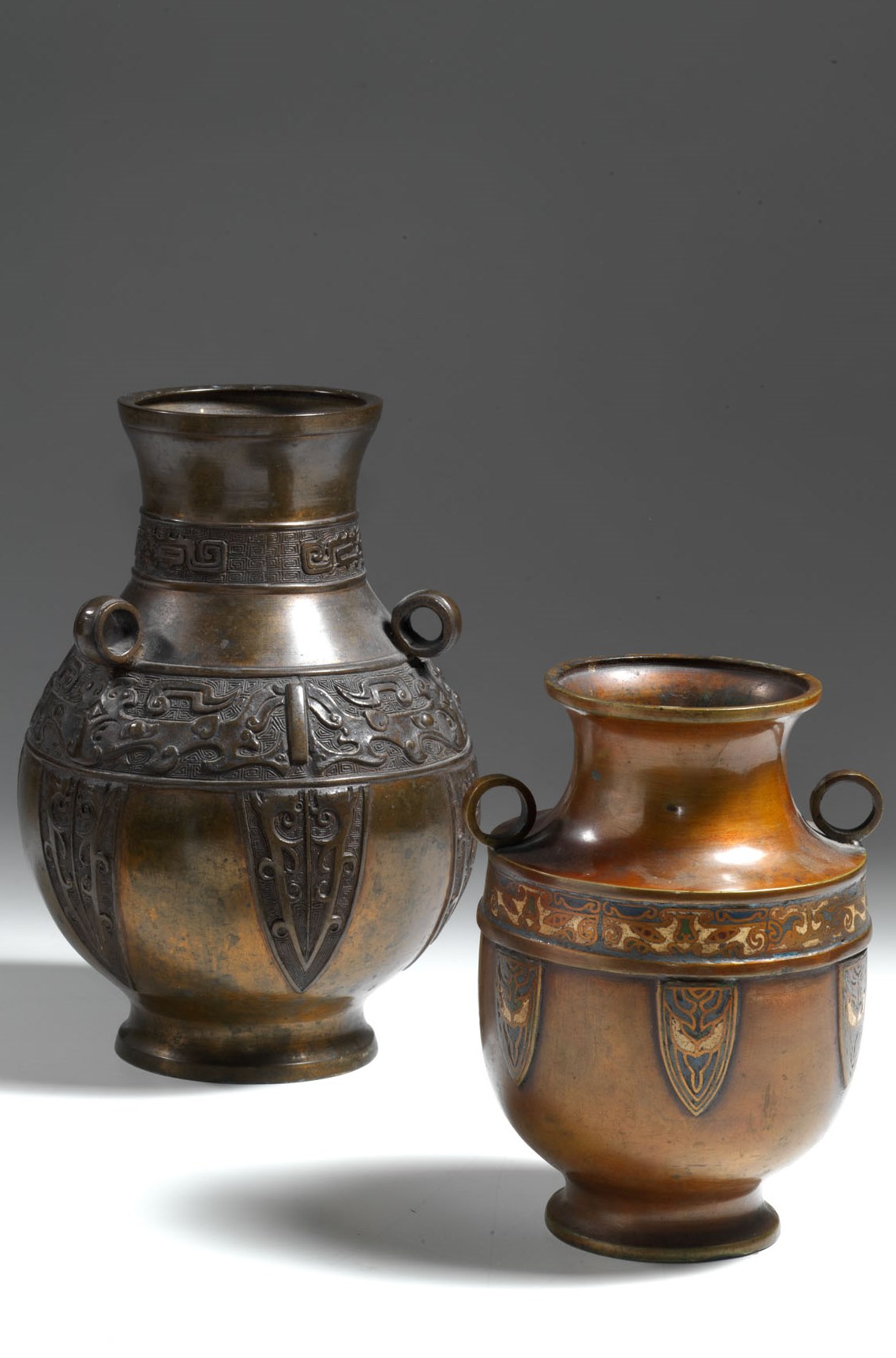 globulare ornato con coppie di draghistilizzati e affrontati entro riquadri lanceolati, alt. cm 24 e vaso Cina sec. XIX in metallo di forma e decori analoghi alt. cm 18 (2)