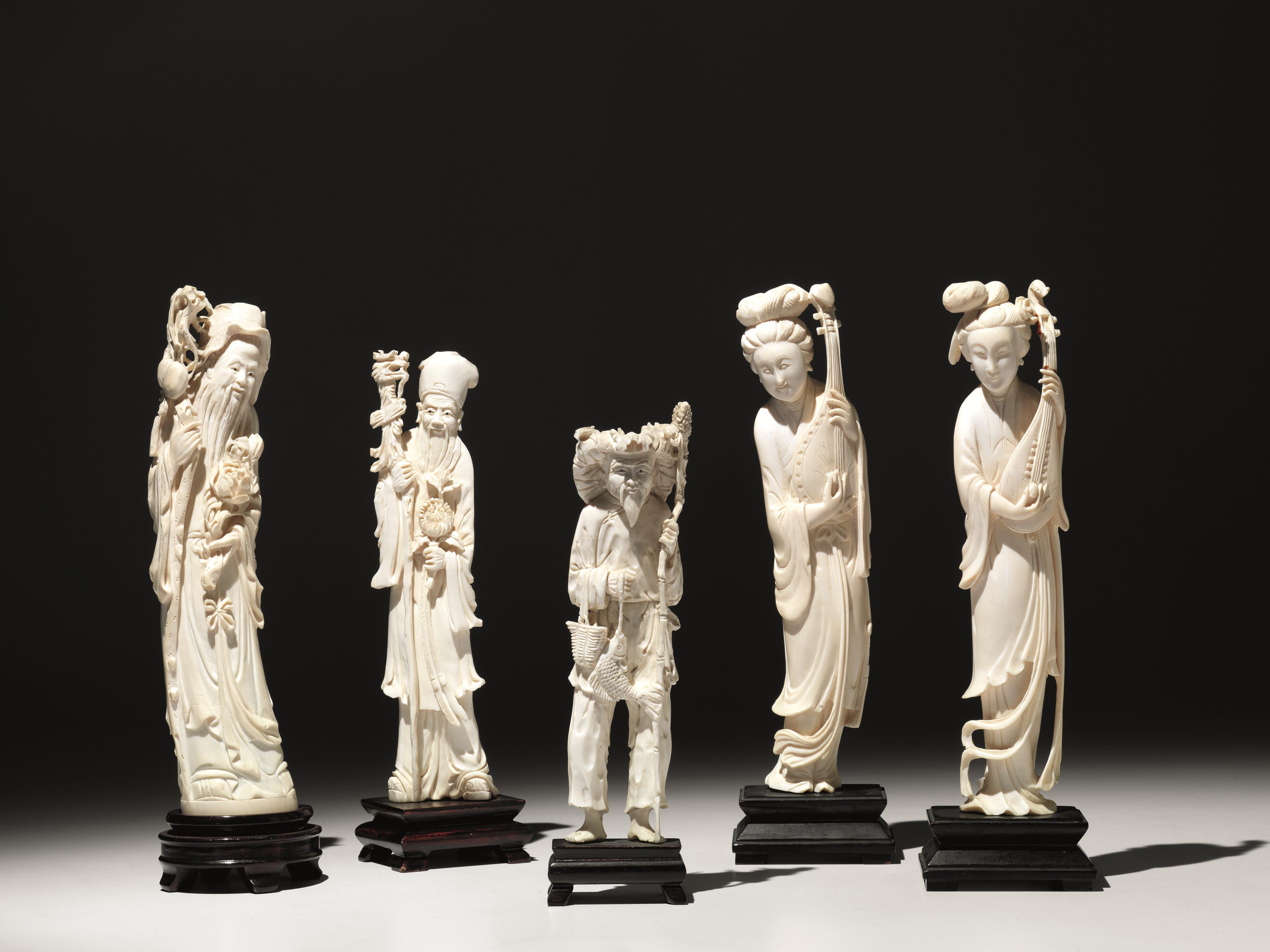 Due intagli Cina Sec. XIX-XX, in avorio scolpito nella forma di saggi stanti con fiori di loto nella mano destra e lungo bastone nella sinistra, alt. cm 23; alt. cm 26, su basi in legno alt. cm 2,5, alt. cm 4 (2)
