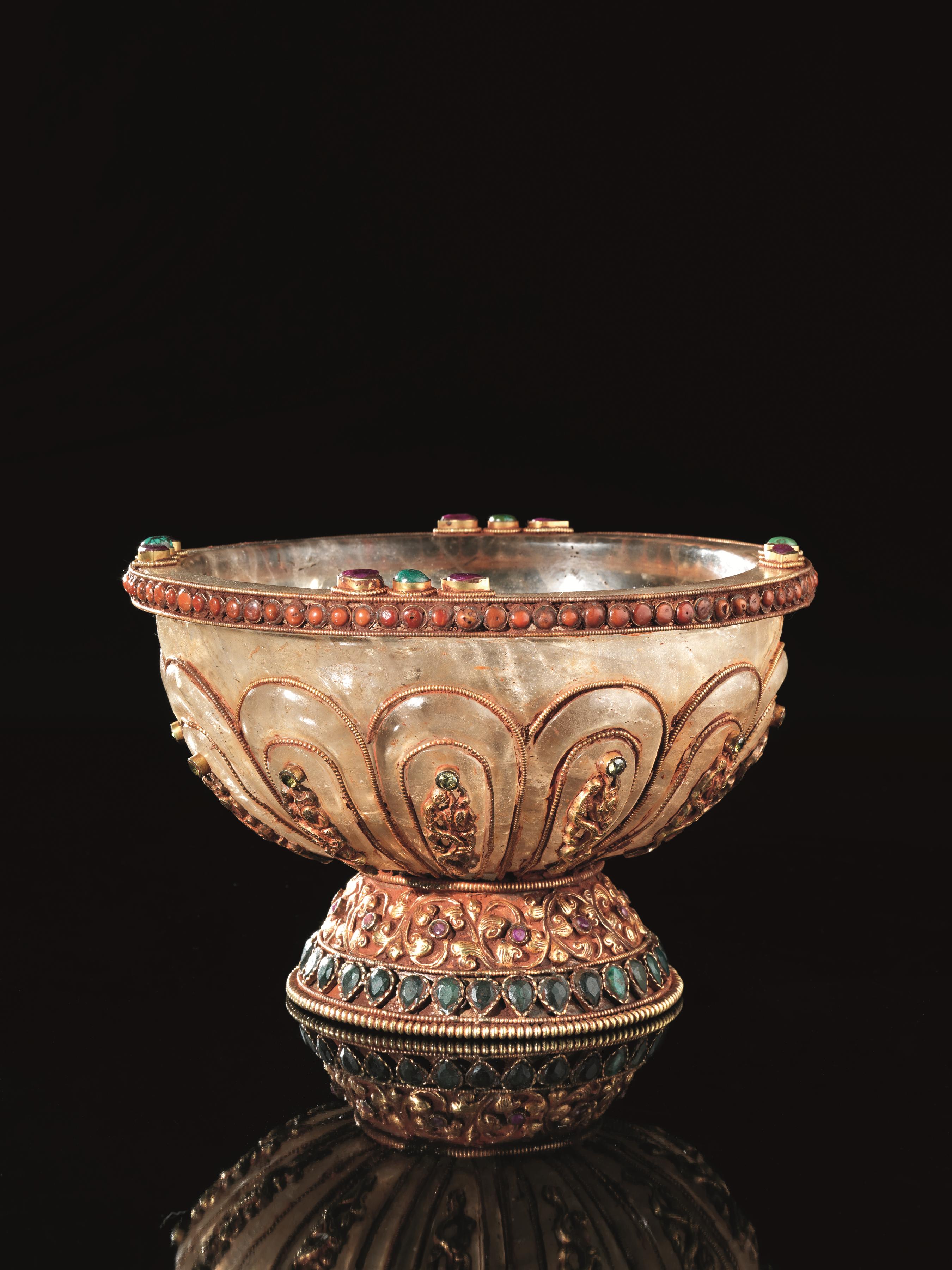 Coppa tibetana, sec. XIX, in cristallo di rocca con applicazioni in metallo dorato e decorata con pietre semipreziose, radici di rubini e smeraldi, diam. cm 18