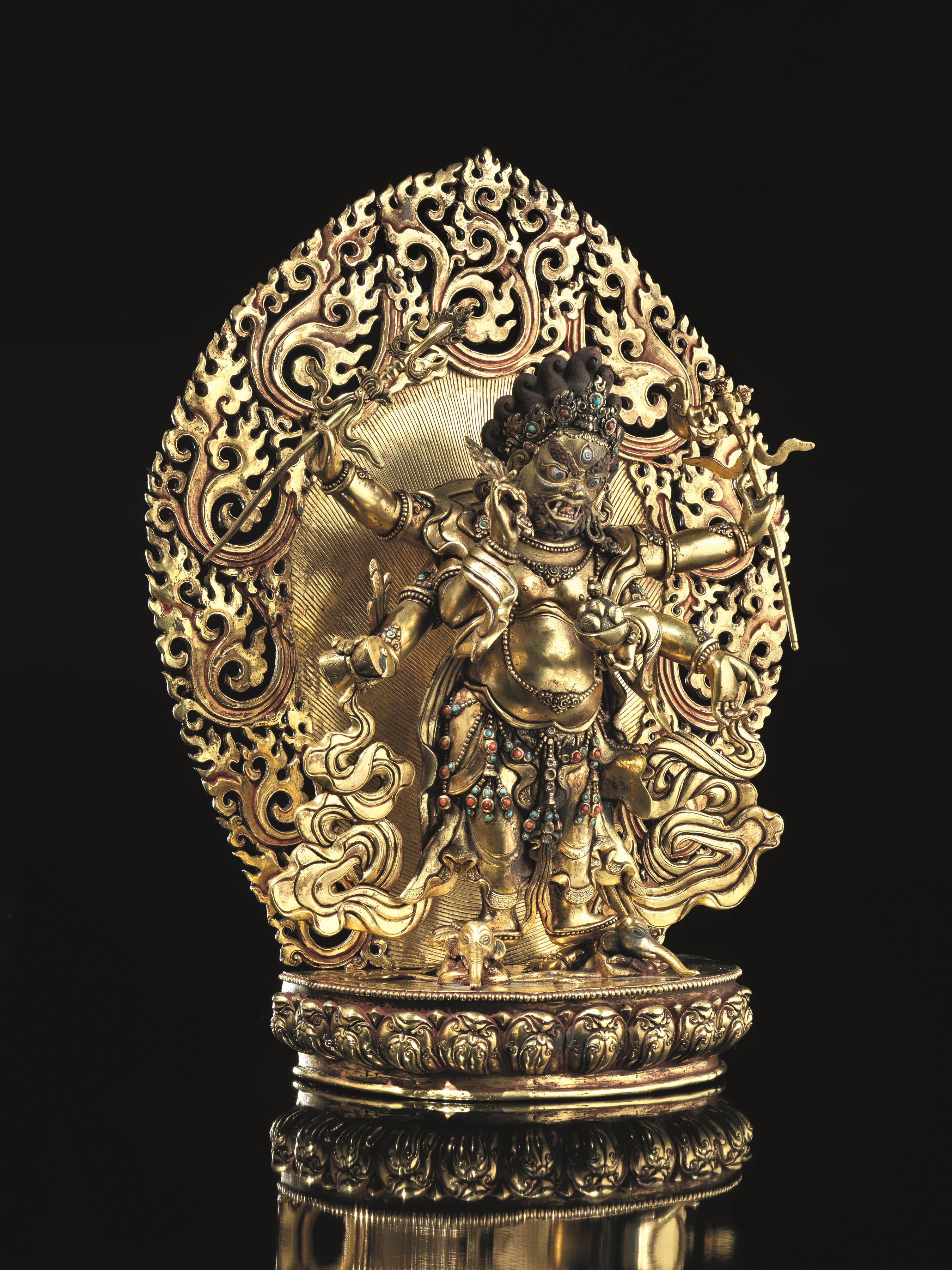 Scultura Tibet, fine sec. XIX inizi XX, in bronzo dorato, raffigurante Mahakala stante su due elefanti prostrati ai suoi piedi, vestita con un dhoti e adornata con vari gioielli, le sei mani armate, con spade e coppe, la faccia con la bocca aperta, e lo sporgente terzo occhio sormontato dalla corona adornata di teschi, la figura circondata da festoni e sul retro una brillante fiamma, alt. 42