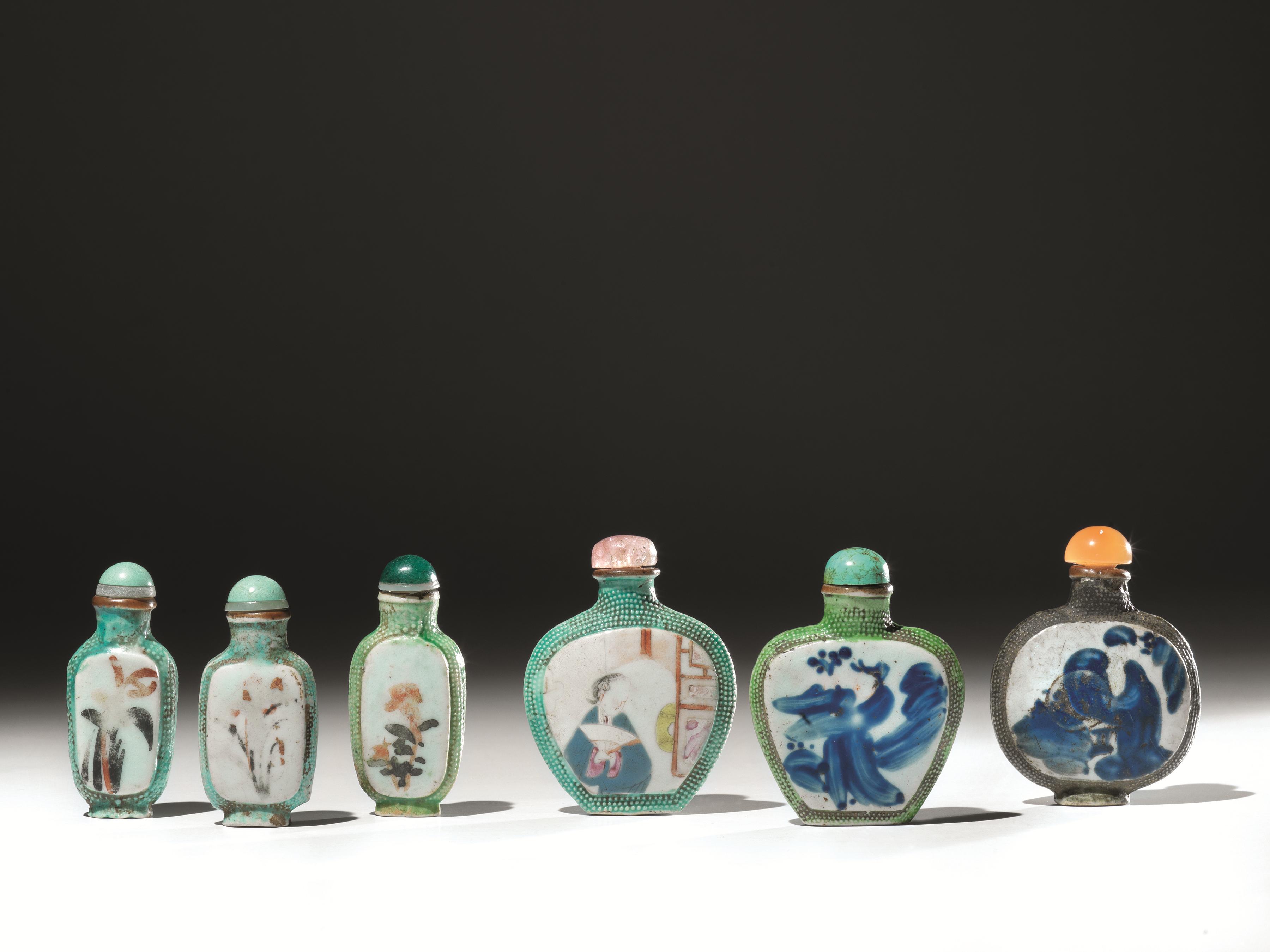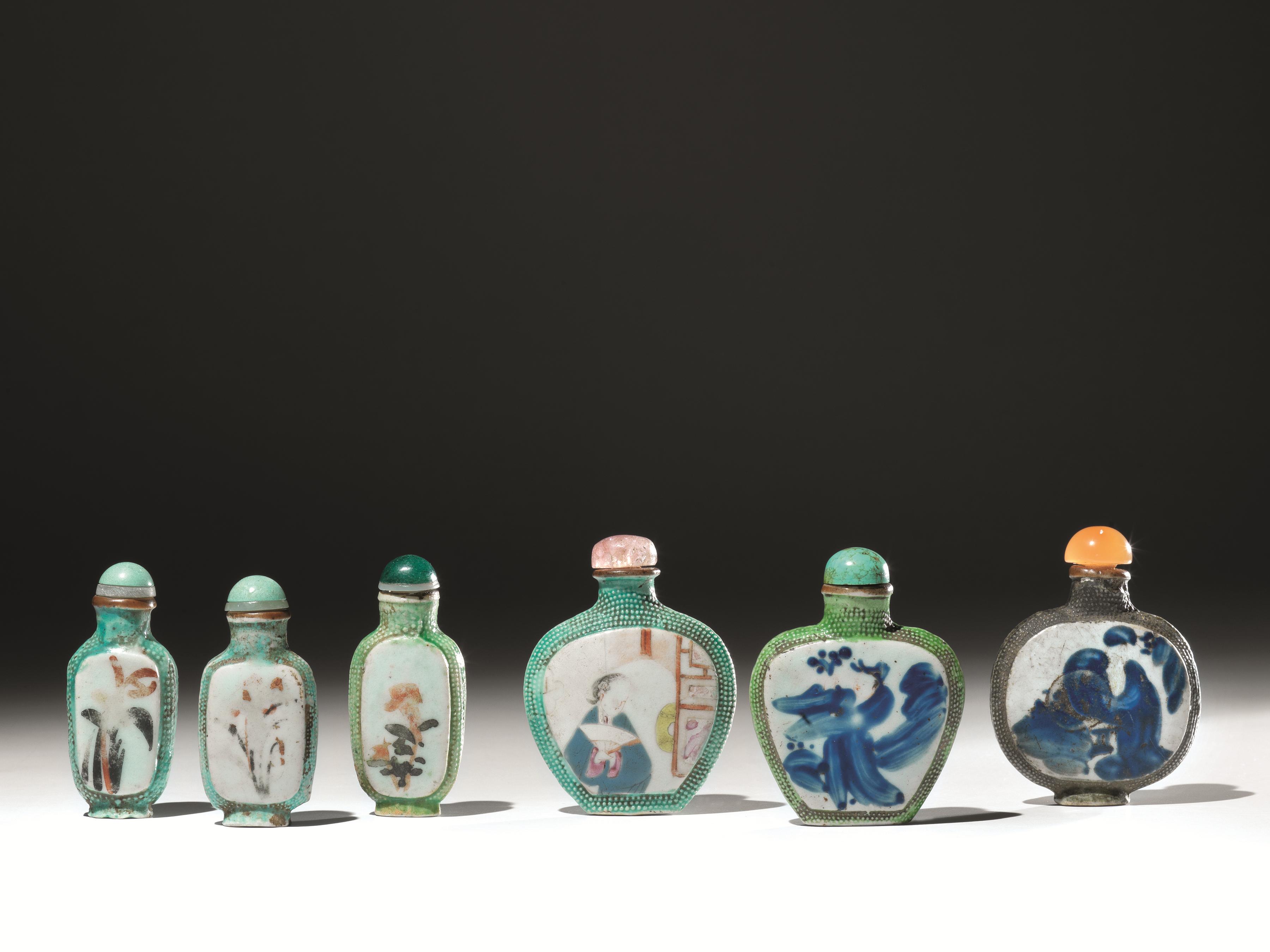 Sei snuff bottles, Cina sec. XIX-XX, in porcellana policroma, tre dalla forma...