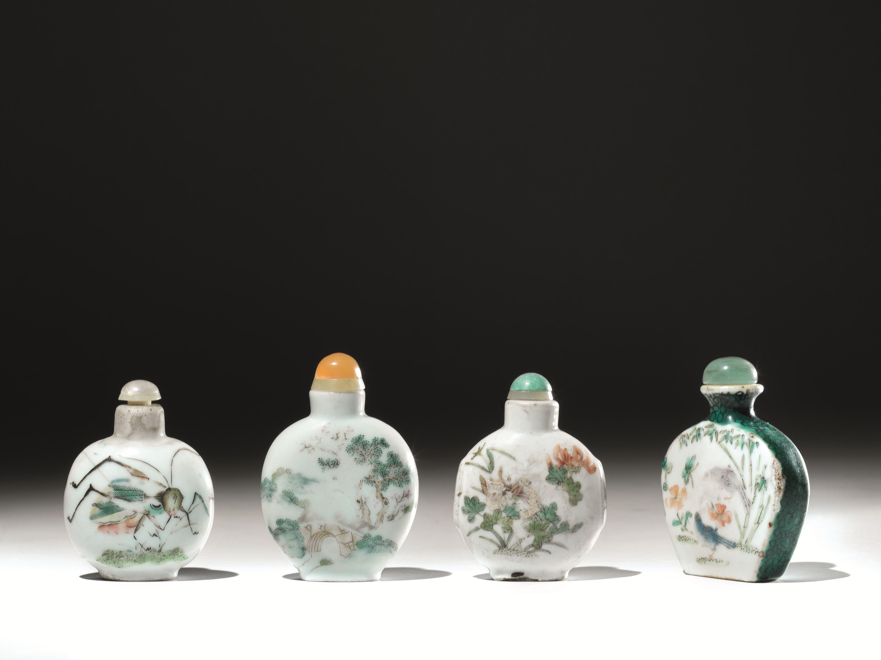 Quattro snuff bottles Cina sec. XIX -XX, in porcellana policroma decorate con...