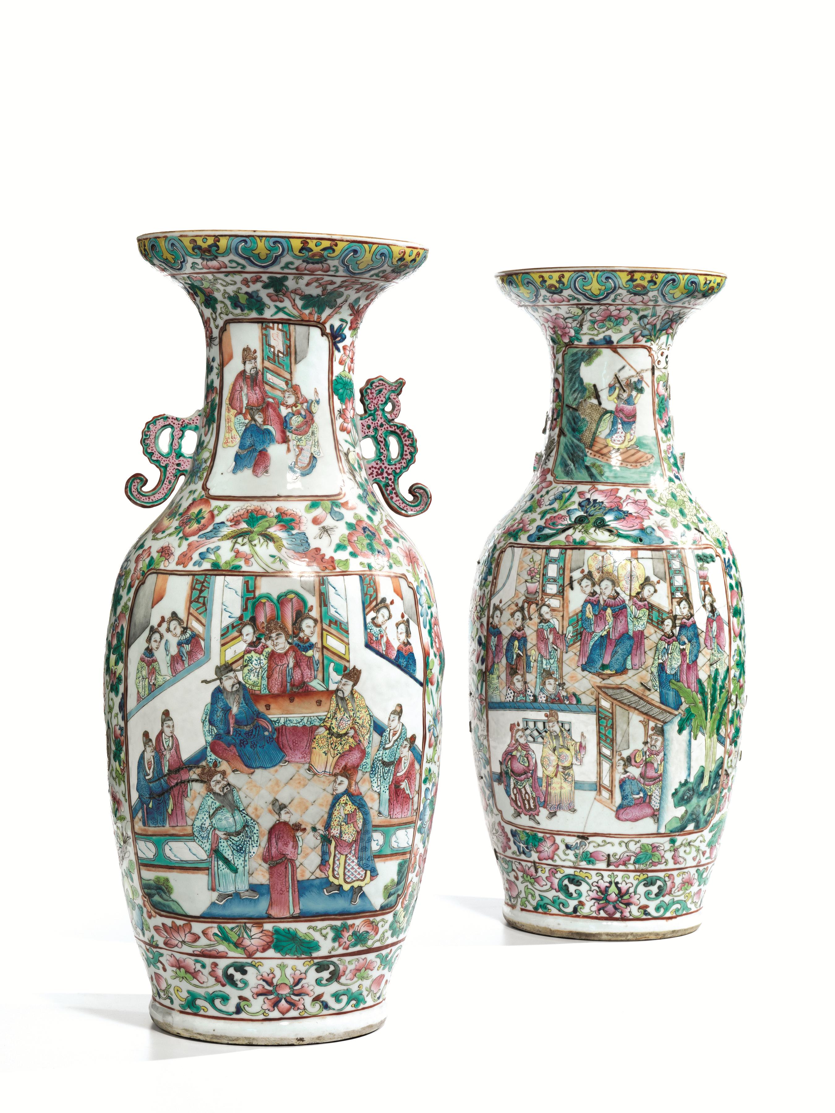 Coppia di grandi vasi manifattura di Canton Cina sec. XIX dinastia Qing, in porcellana policroma della famiglia rosa, dalla forma a balaustro e il collo a tromba, decorati con scene di vita di corte entro riserve squadrate, e il resto del corpo decorato con motivi floreali, alt. cm 60 danni e mancanze e vecchi restauri