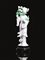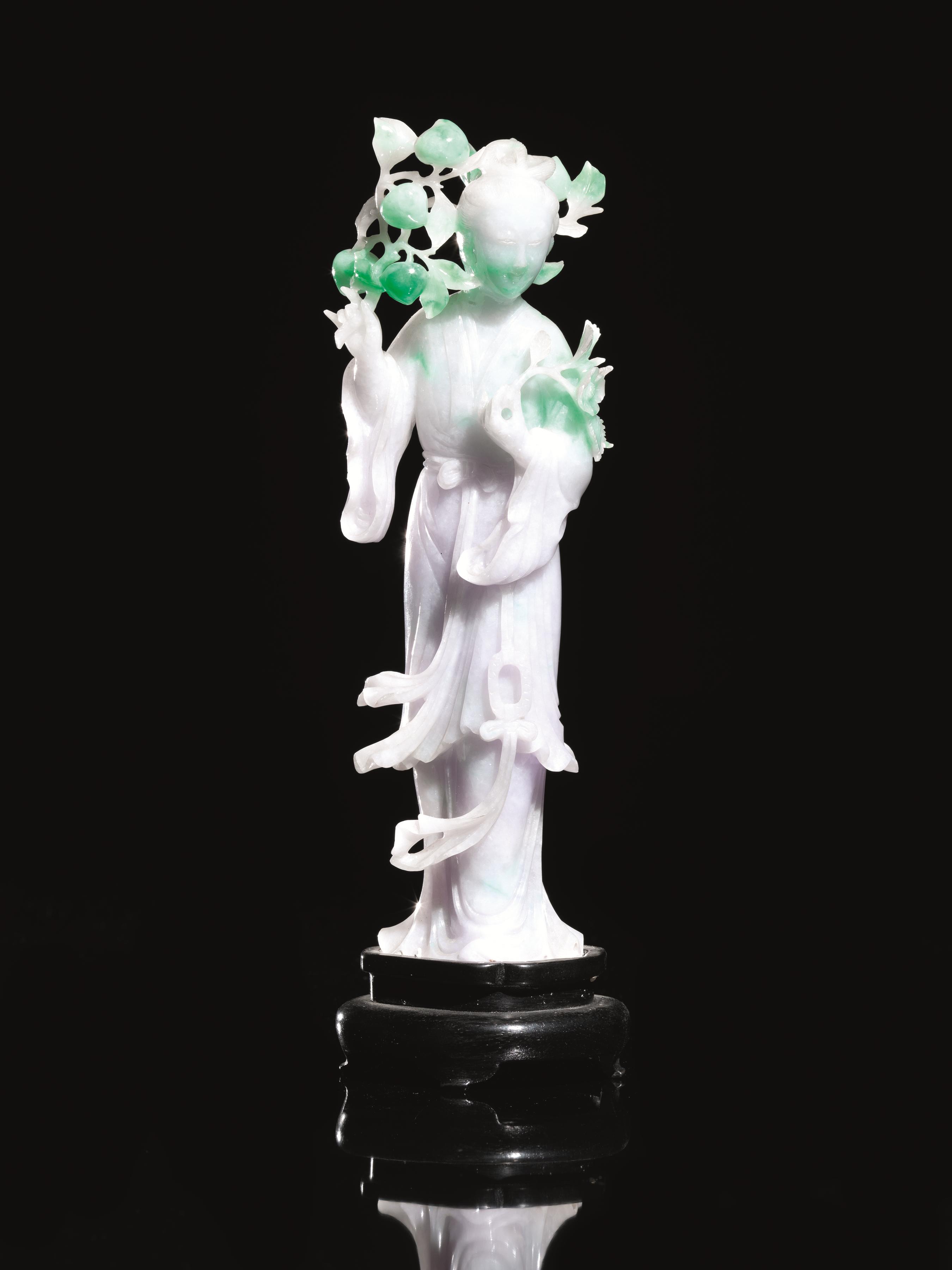 Intaglio, Cina sec. XIX-XX, in giadeite nei toni del verde pallido e smeraldo, raffigurante Guanyn stante con rami di pesco tra le mani, alt. cm 22, su base in legno alt. cm 4