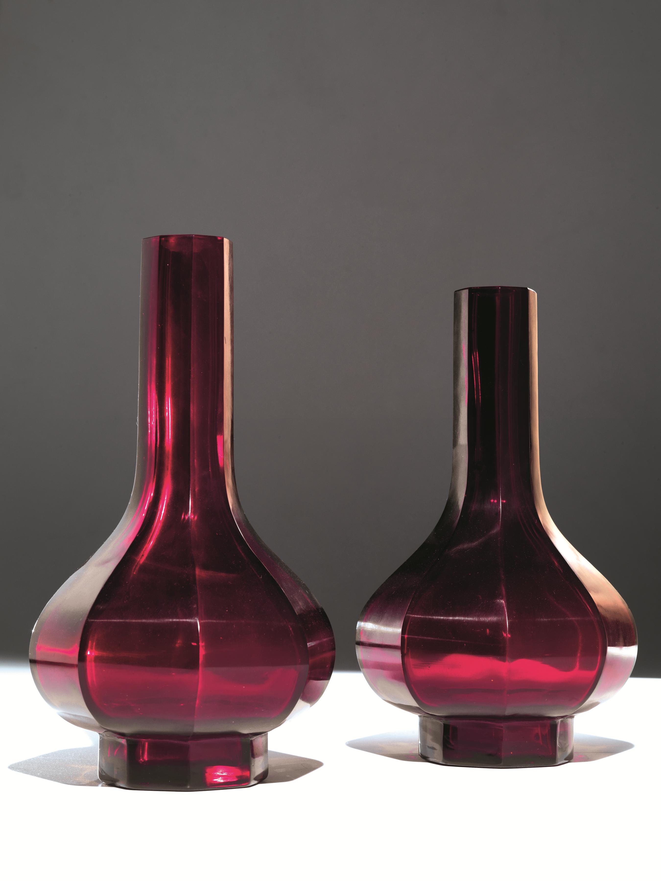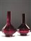 Coppia di vasi, Cina sec. XX, in vetro rosso di Pechino con base ottagonale e lungo collo, alt.cm 30 (2)