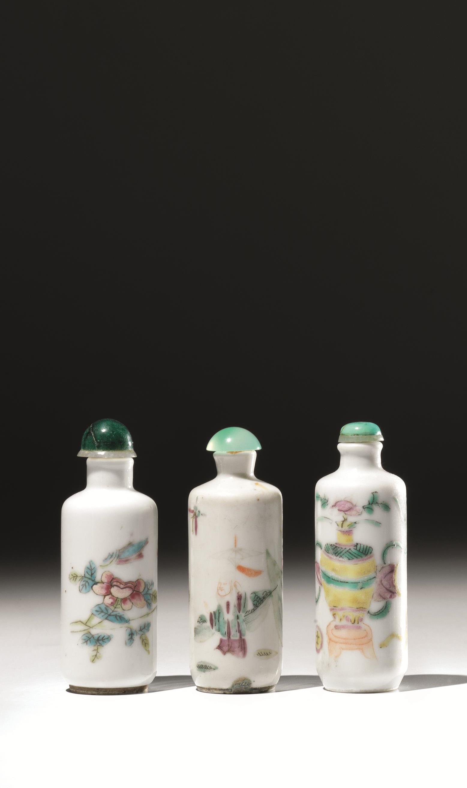 Tre snuff bottles, Cina sec. XIX-XX, dalla forma cilindrica in porcellana...