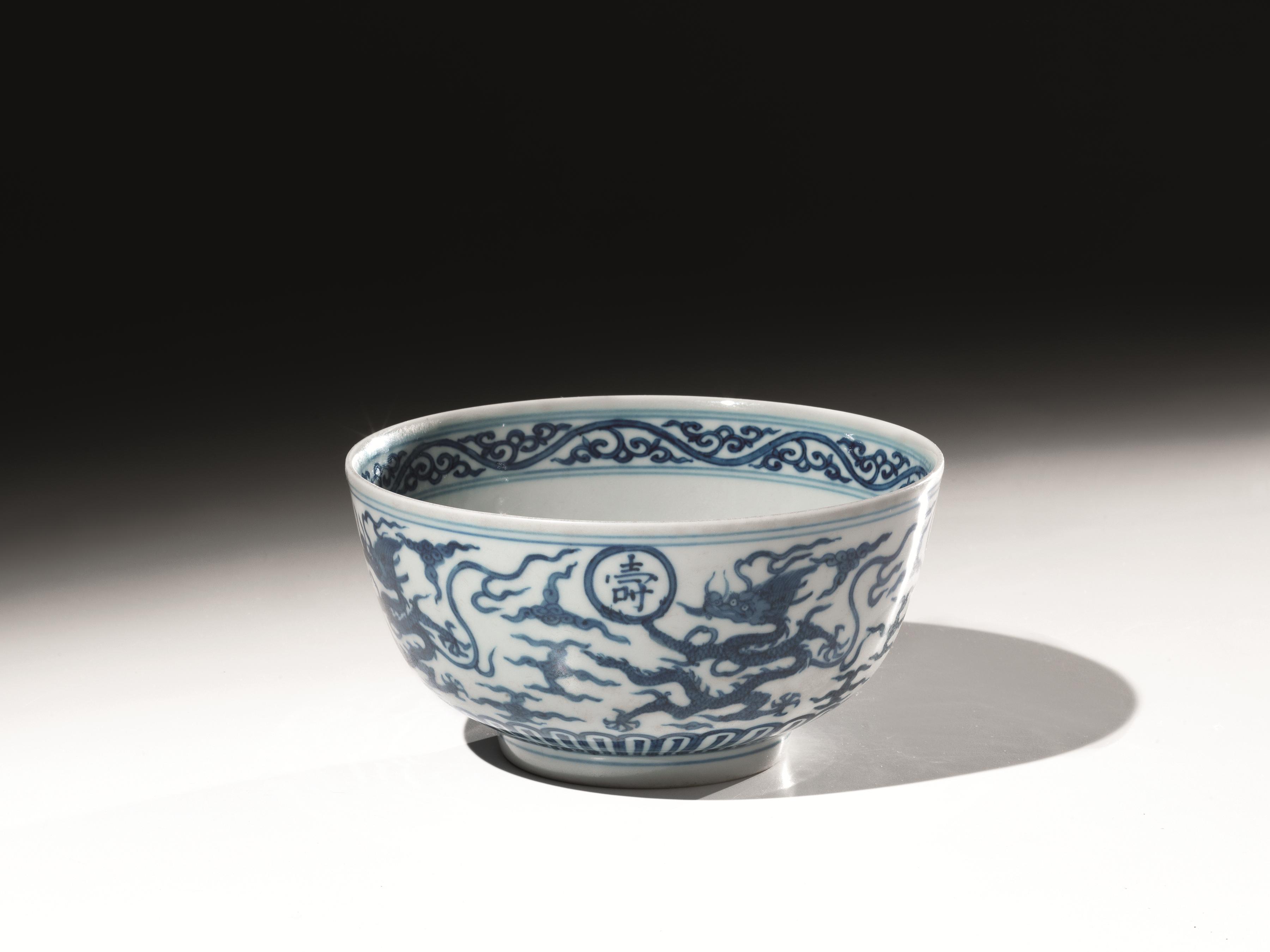 Coppa Cina sec. XVIII-XIX, in porcellana bianca e blu decorata all’esterno con draghi che si rincorrono, mentre il fondo all’interno è decorato con grandi fiori di loto e l’orlo della coppa decorata con fascia a motivi geometrici, reca sul fondo marchio della dinastia Ming periodo Jiajing (1522-1566), diam. cm 18