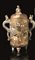 Contenitore, Giappone sec. XIX-XX, in porcellana satsuma sui tono dell’oro, dalla forma cilindrica, due manici laterali a for- ma di drago e il pomello del coperchio modellato della forma di un saggio assiso, alt. cm 27, sbeccature all’interno del coperchio