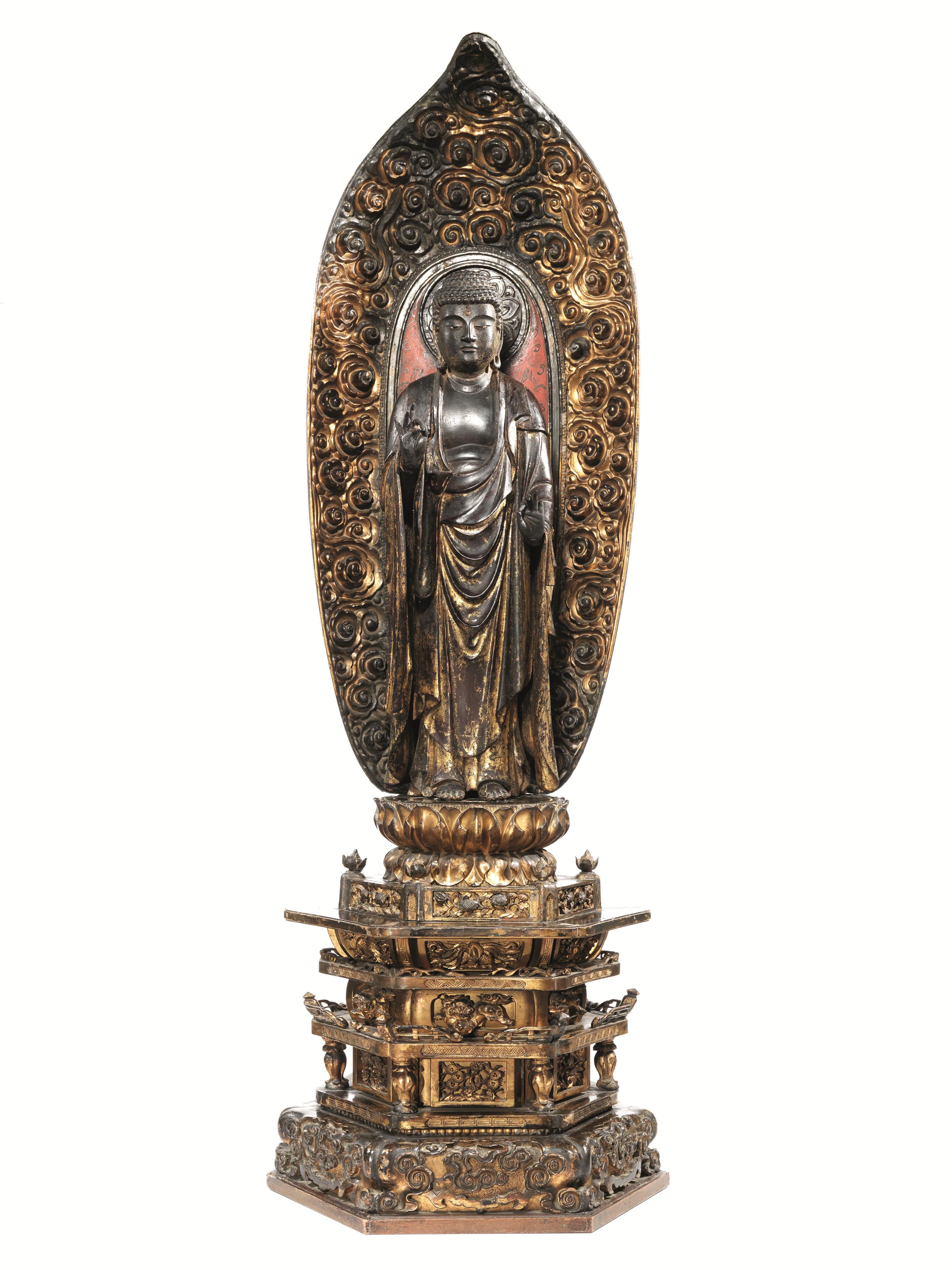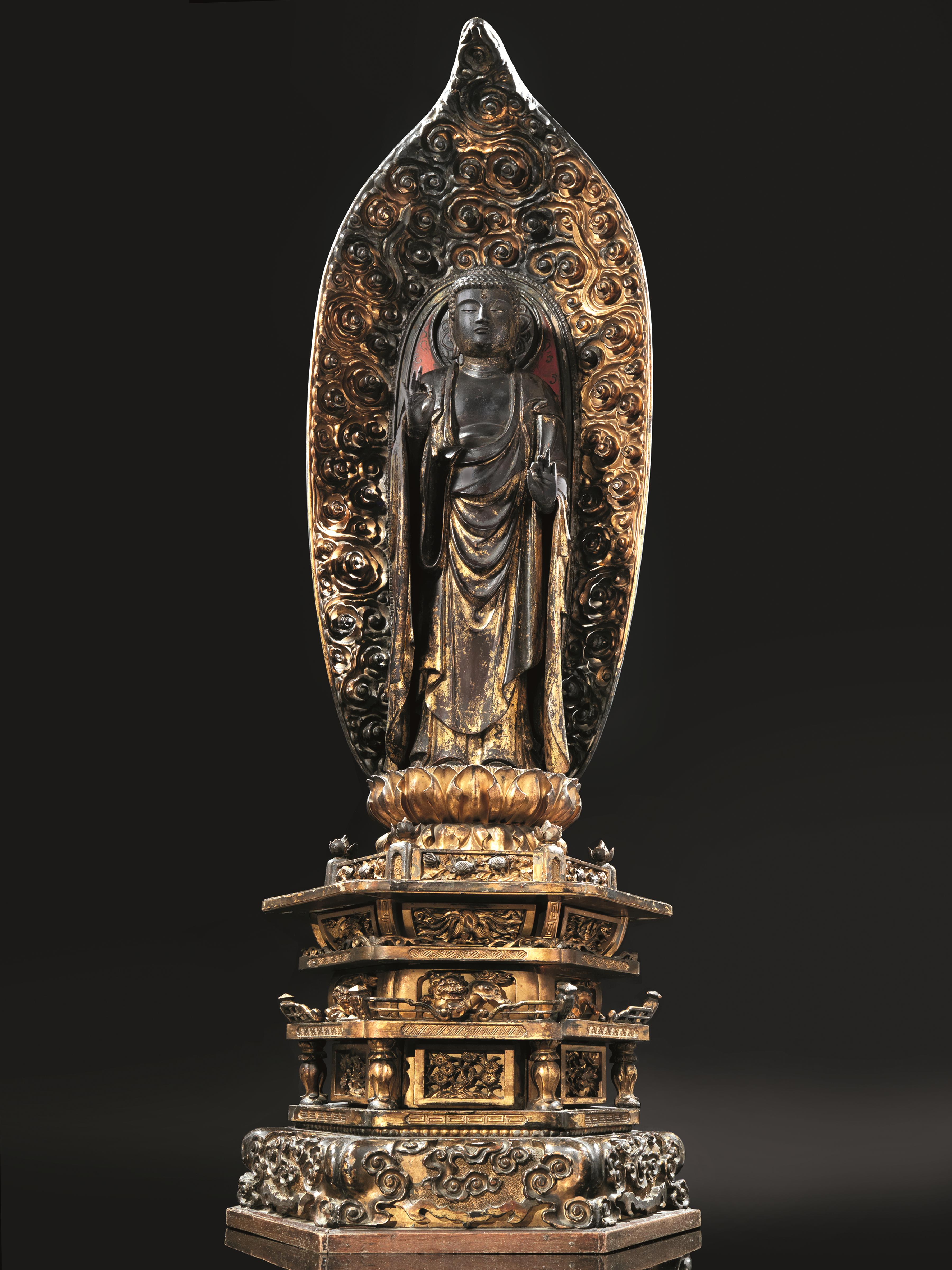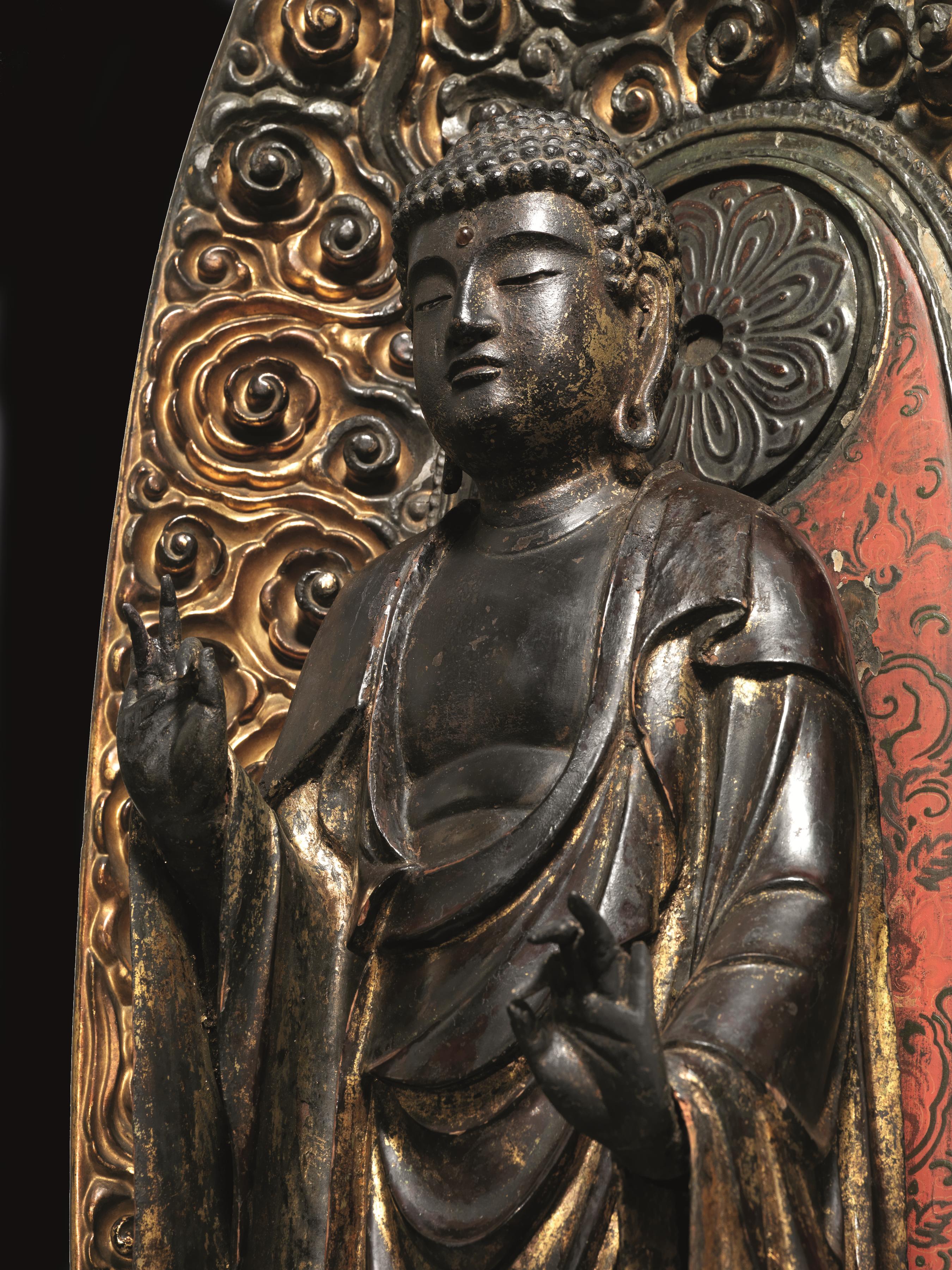 Grande scultura, Giappone sec. XVIII - XIX, in legno laccato e dorato, raffigurante Buddha stante con ambedue le mani nel Vitarka mudra il gesto dell’insegnamento, il Buddha circondato da una gande fiamma e poggiante su una grande base a plinto decorata con cani di Phò alt. cm 160, danni e mancanze diffusi