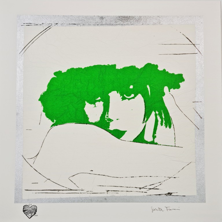 FIORONI GIOSETTA Roma 1932 “Doppio liberty verde luminoso”serigrafia materica con pigmento verde luminoso cm 50x50 del 2010. Firmata sul fronte in baso a destra, tiratura 41/100 a sinistra. Certificato di autenticità a cura della Spirale Milano srl e autenticato dall'Archivio Parise Fioroni con timbro a secco.