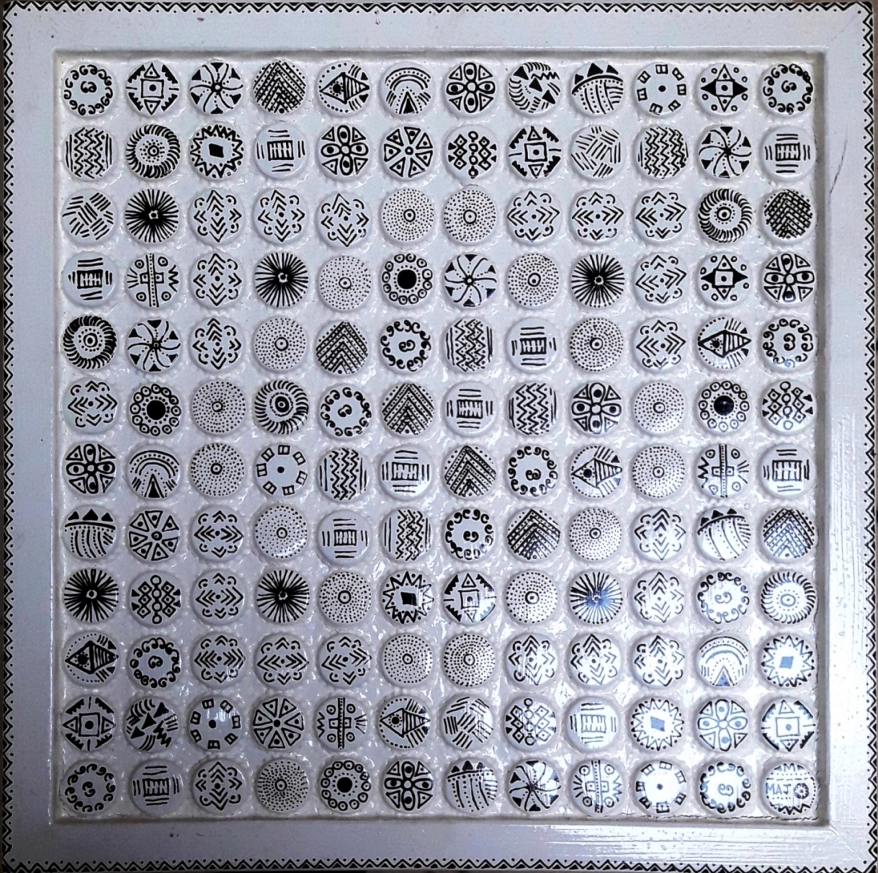 MAJO MARGARET Africa “Senza titolo” tappi di bottiglie decorati a mano e tecnica mista su tavola cm 40x40. Firmata sul fronte in basso a destra.