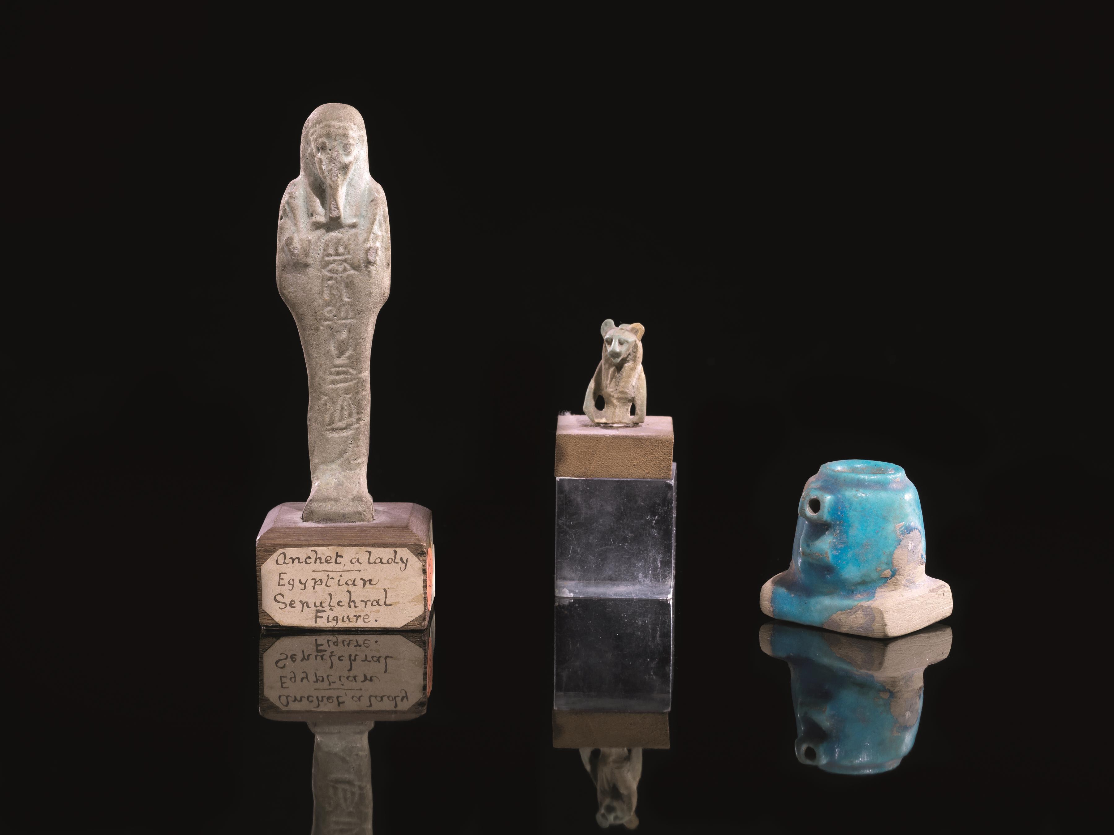 Ushabti e due oggetti in faienceMateria e tecnica: faience egiziana verde...