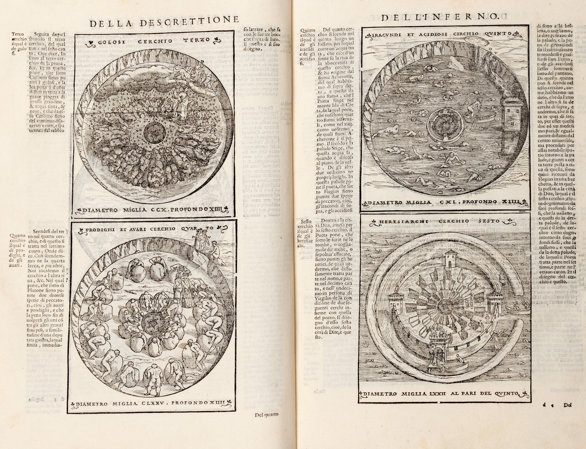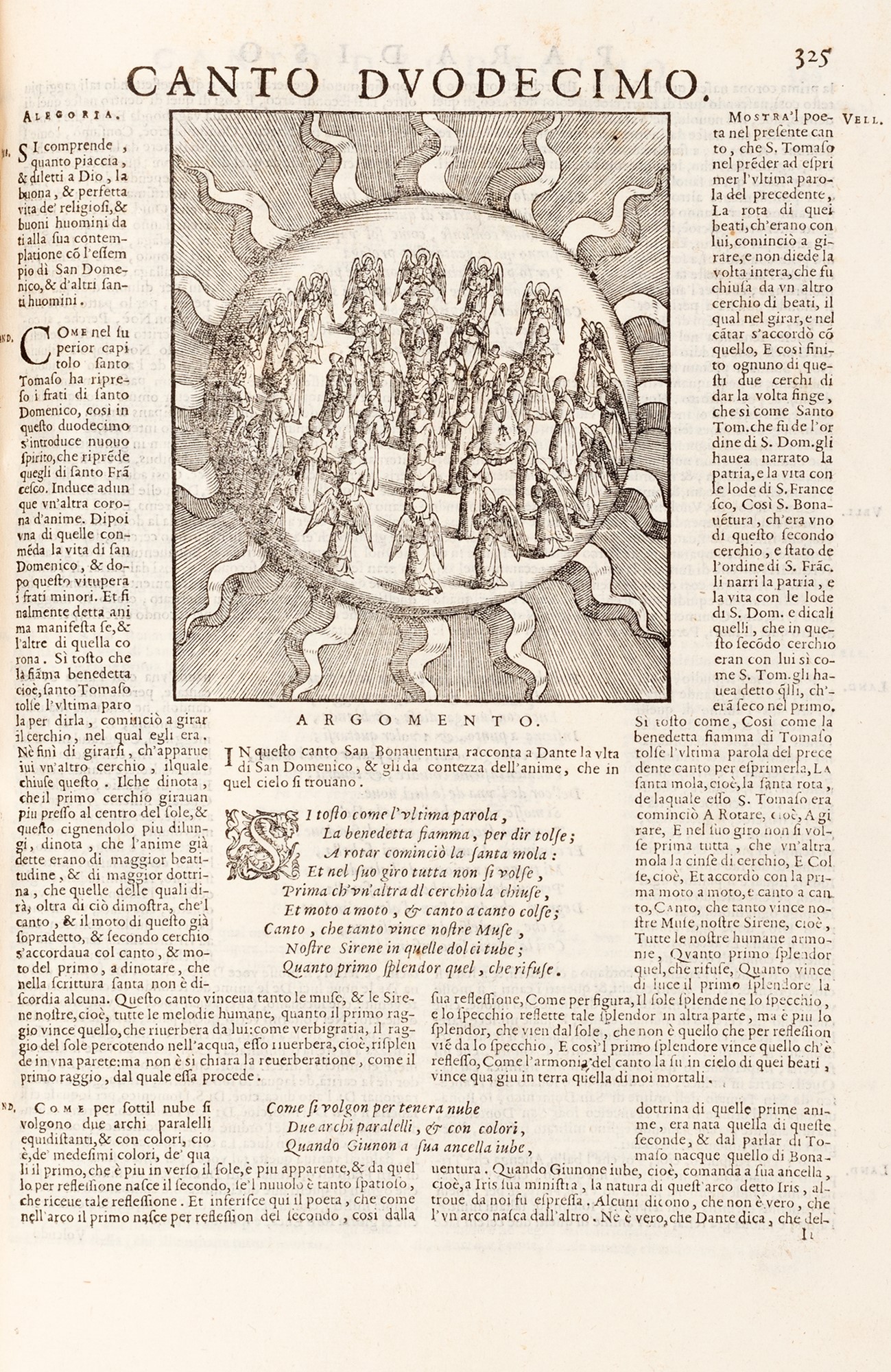 Venezia, Sessa, 1578. In 2°. Grande ritratto di Dante dentro ovale in ricca cornice xilografica al frontespizio, marca tipografica al colophon, una grande tavola xilografica con altro ritratto di Dante, rappresentazione dei tre regni, e ritratti dentro medaglione di Virgilio e Stazio, 97 illustrazioni xilografiche, grandi tavole incise in legno all'inizio di ogni cantica, splendide testatine e capilettera figurati, testo in carattere corsivo al centro contornato dai commenti in carattere tondo su due colonne, piccoli fori di tarlo al frontespizio, nel margine interno della maggior parte dell'esemplare ed all'ultima carta di entità diversa, alcune carte brunite, leggere macchie, legatura coeva in pelle marrone, ai piatti decorazione impressa a secco, dorso a 3 nervi, restauri e fori, astuccio in cartonato grigio moderno. Al frontespizio firma di appartenenza.