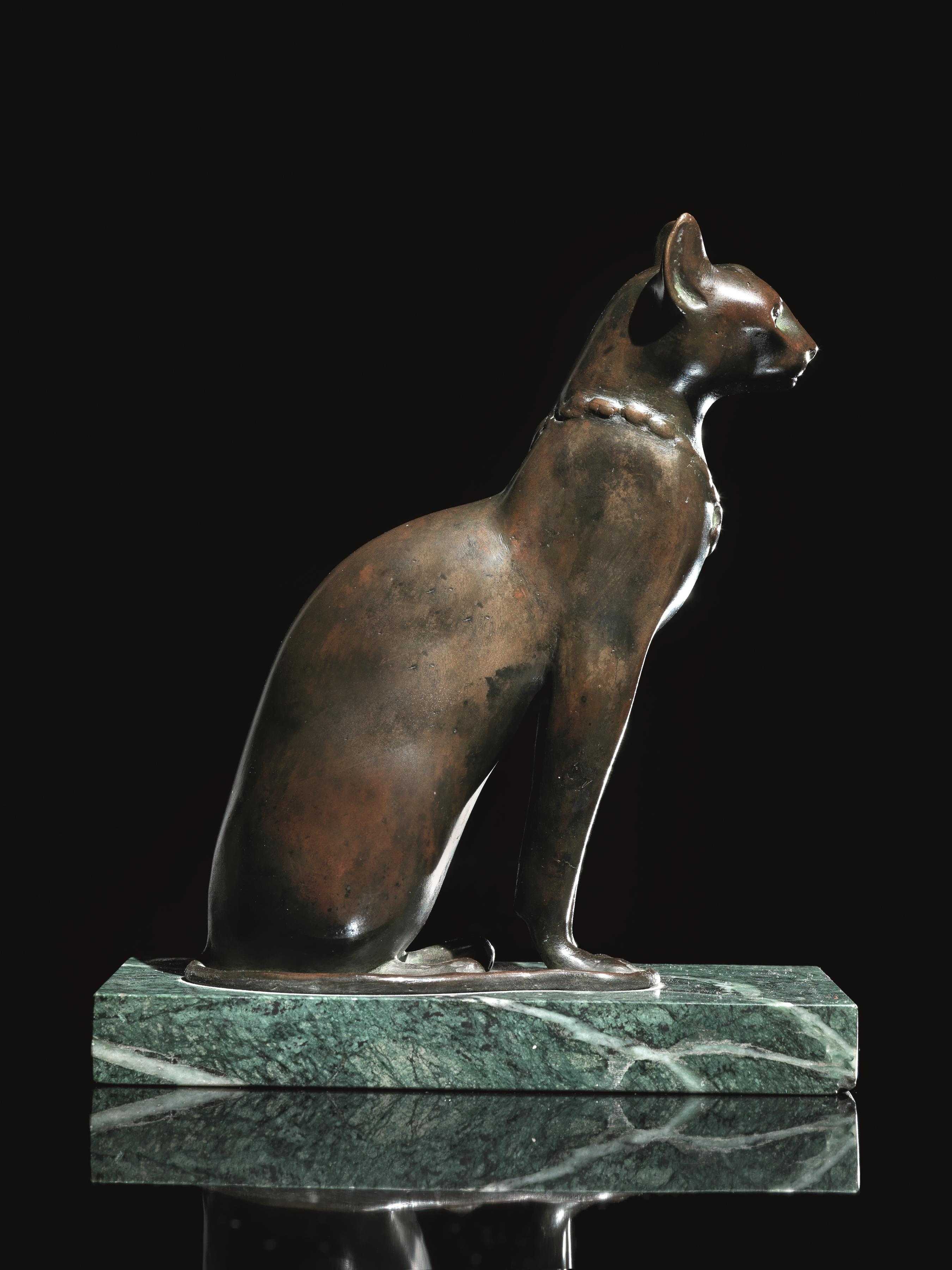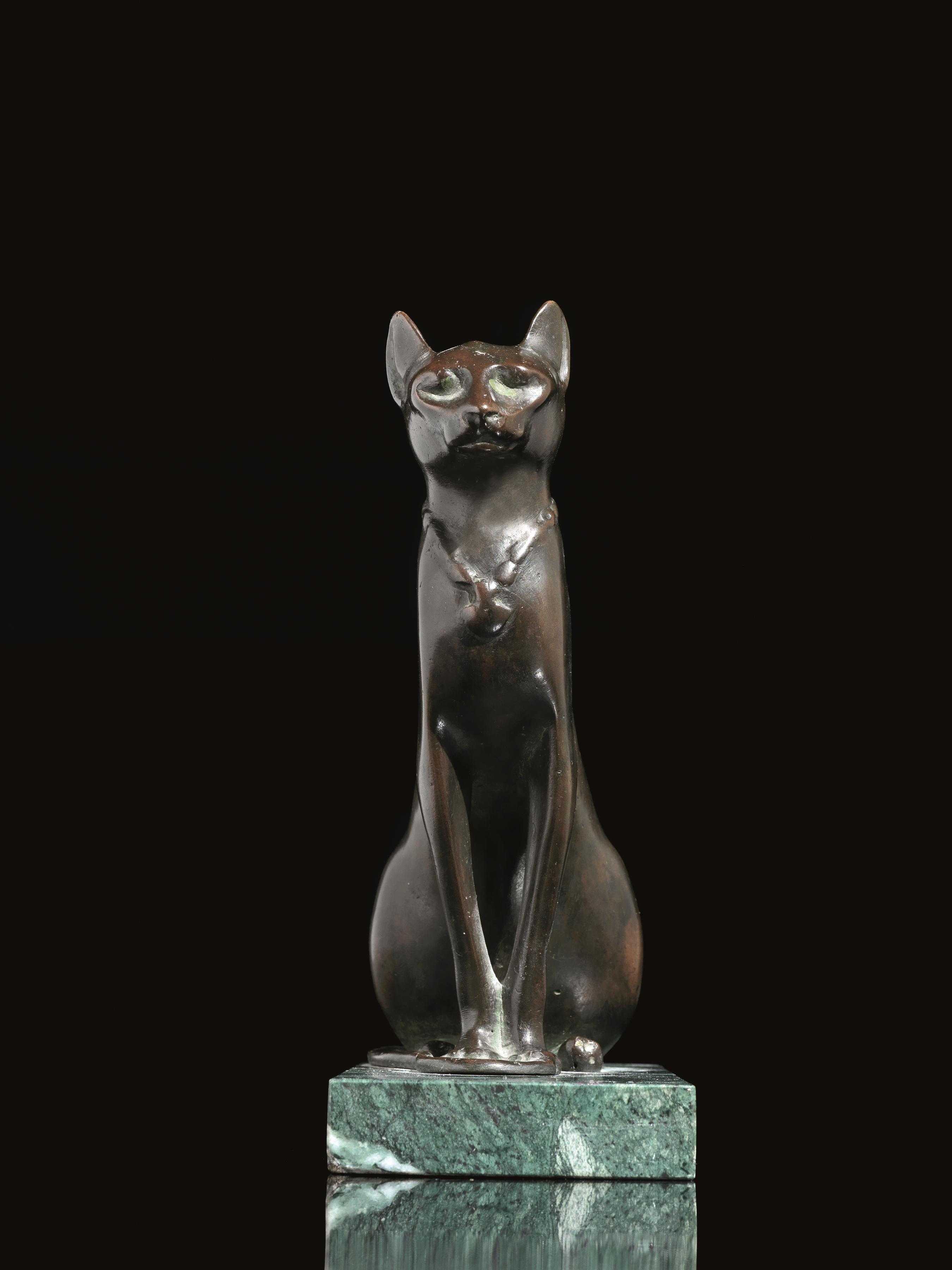 Statuetta di gatto, l'animale sacro alla dea Bastet, seduto sulle zampe posteriori con la coda ripiegata fino alle zampe anteriori, erette. Testa triangolare con grandi occhi, orecchie ritte e appuntite, al collo l'animale porta una collana formata da numerose perle ellittiche e terminante al centro con un'egida che raffigurava la dea. La posizione seduta con le zampe anteriori raccolte mette in evidenza il portamento elegante e fiero. La dea Bastet era la protettrice della casa e della famiglia e portatrice di gioia, canti e danze, nel suo aspetto pacifico; invece come personificazione di Sekhmet incarna la dea della guerra e della distruzione. La statuetta è un'offerta votiva per il tempio della dea come ringraziamento e richiesta di buon auspicio.