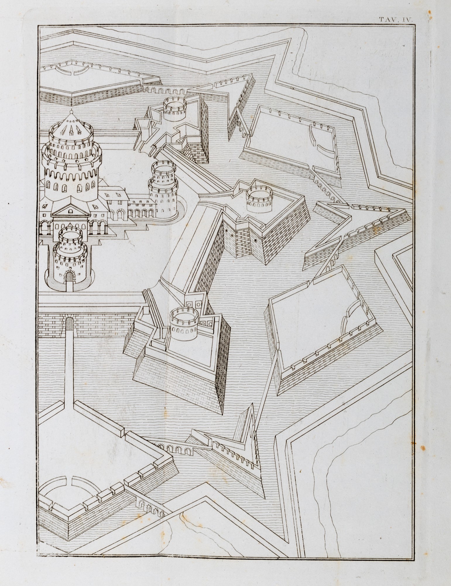 Modena, Società Tipografica, 1816. In 2°. 210 x 290 mm., ritratto di De Marchi all'antiporta, 4 grandi tavole ripiegate i fine volume, conservata la brossura editoriale verde entro legatura moderna. § Ippolito Caffi. Lezioni di Prospettiva Pratica. Roma, Belle Arti, 1835. In 8°. 16 tavole ripiegate in fine volume, difetti e restauri, legatura moderna in mezza pelle blu. § Vincenzo Antonio Rossi. Manuale per la Misura delle Fabbriche. Napoli, Fibreno, 1837. In 8°. 12 tavole ripiegate in fine volume, legatura coeva in mezza pelle verse. § Flavio Vegezio. Dell'arte della Guerra. Firenze. Giovanni Marenigh, 1815. Legatura moderna in mezza pelle verde, esemplare in barbe.