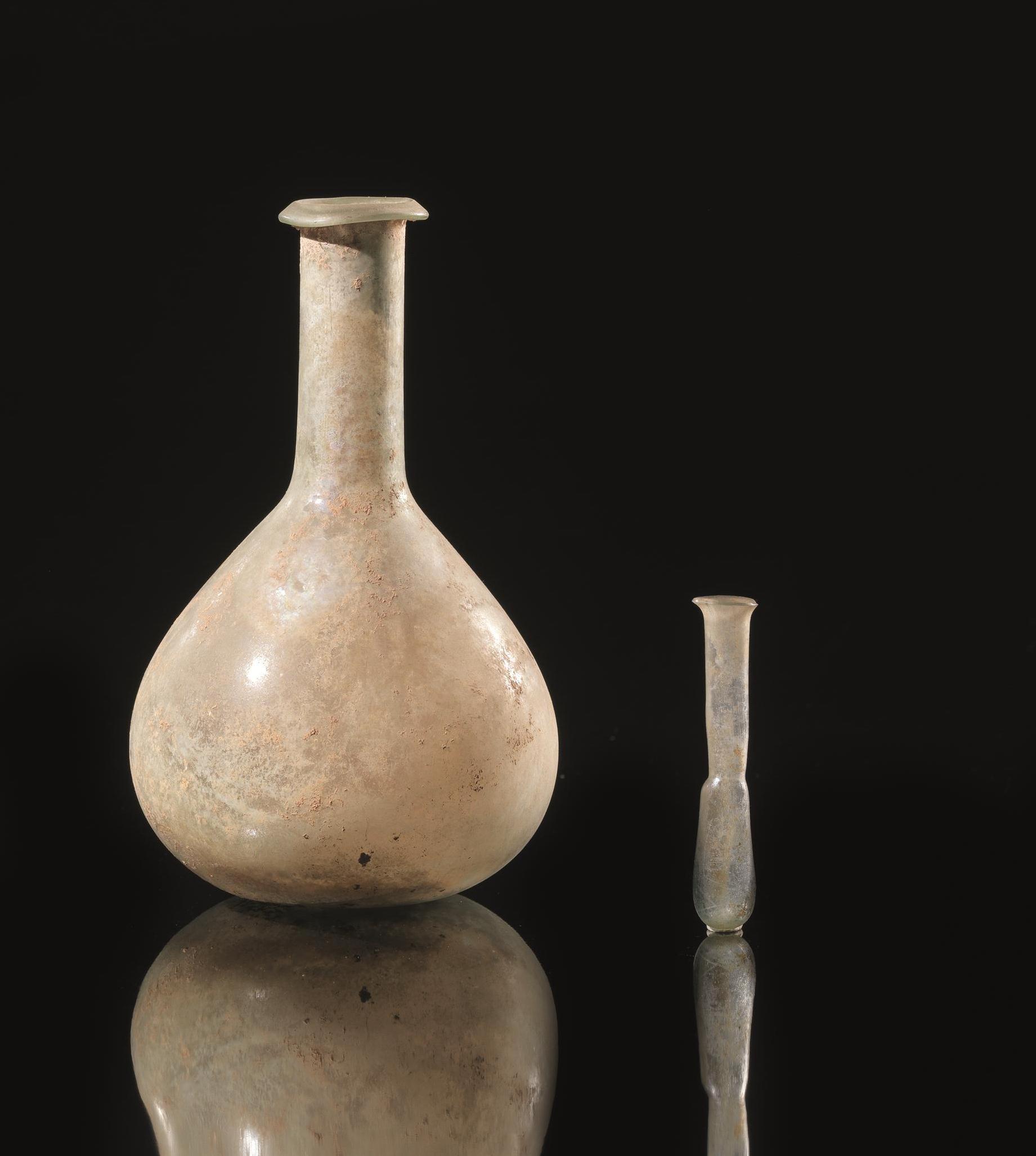 Fiasca e unguentarioMateria e tecnica: vetro incolore soffiato a stampoFiasca...