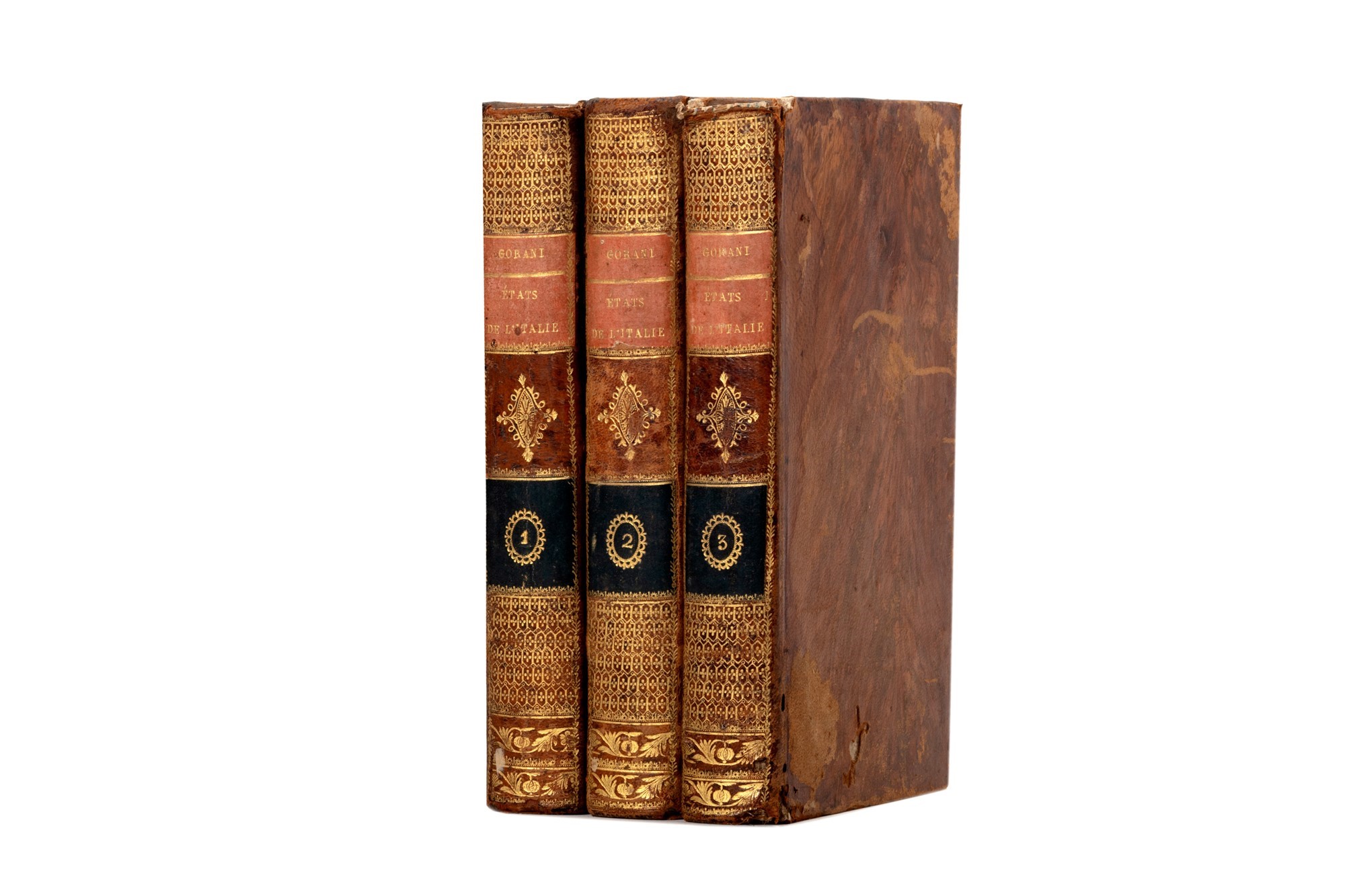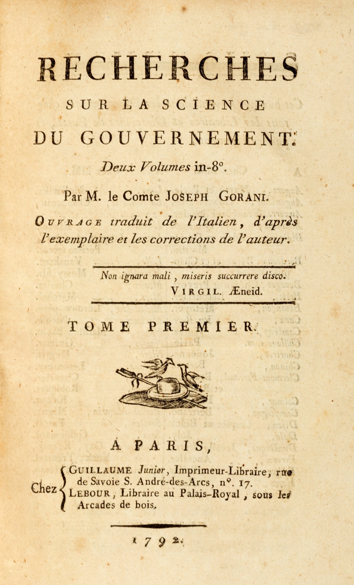 Parigi, Buisson; Lione, Allier et Leclerc; Marsiglia, Mossy, 1793. In 8°. 3 voll. Leggera brunitura, qualche lieve alone, legatura coeva in pelle, dorsi con eleganti decorazioni impresse in oro, tassello rosso con autore e titolo e verde con numerazione dei tomi impressi in oro, lievi difetti alle cerniere, qualche piccola lacuna, qualche spellatura ai piatti. § Gorani, Giuseppe, Recherches sur la science du gouvernement, Parigi, Guillaume Junior et Lebour, 1792. In 8°. 2 voll. In barbe, leggera brunitura. qualche fioritura, conservata la brossura originale in cartoncino blu, legatura di epoca successiva in cartoncino marmorizzato rigido, autore e titolo in oro entro tassello rosso.