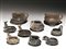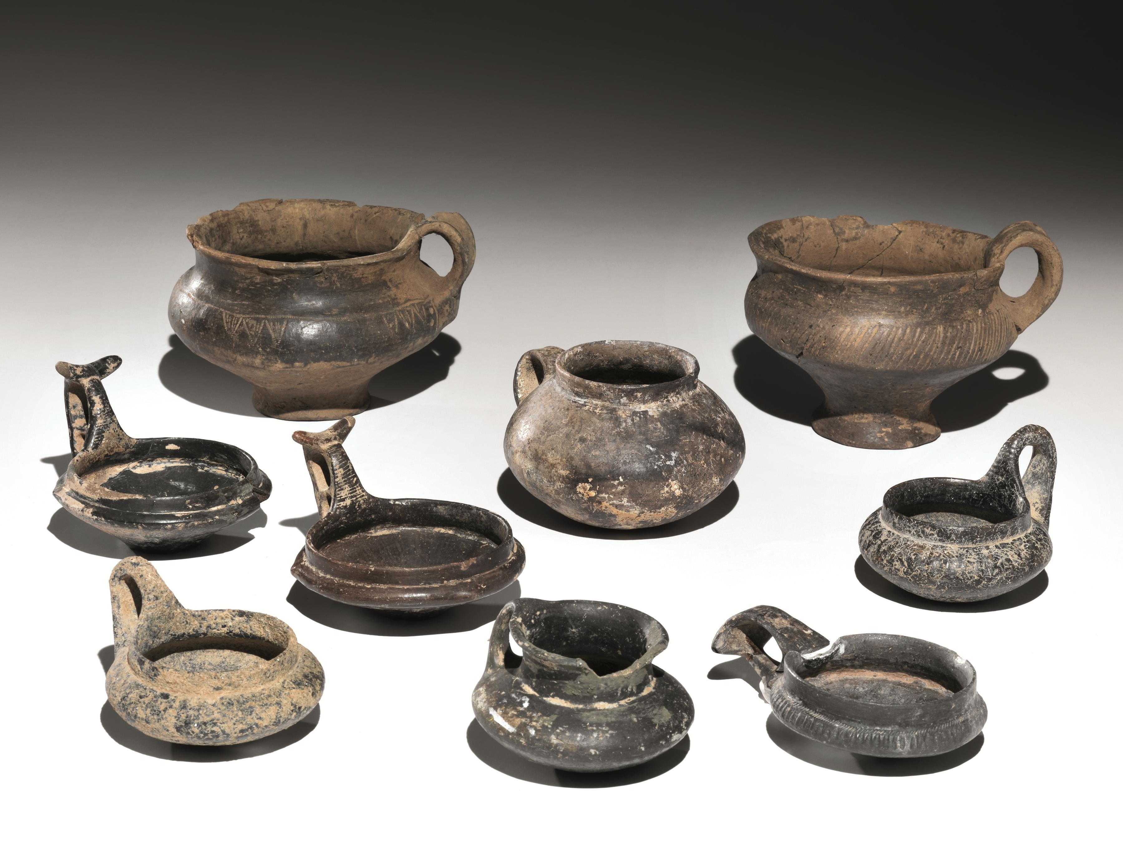 Materia e tecnica: impasto bruno lucidato a stecca, decorazione a lamelle metalliche, modellati a tornio lento.