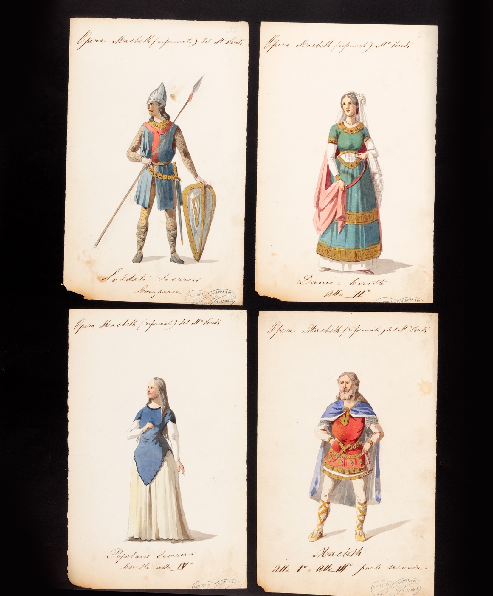 Quattro acquerelli che raffigurano gli abiti di scena per la rappresentazione del Macbet al Teatro La Fenice di Venezia realizzati dalla sartoria teatrale di Milano "Chiappa e Brunetti".