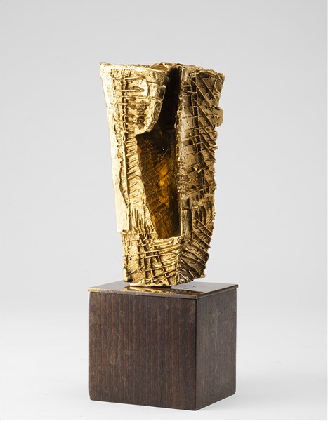 Arnaldo Pomodoro "Studio" 1959 bronzo dorato e legno h cm 18 Firmato, datato 59