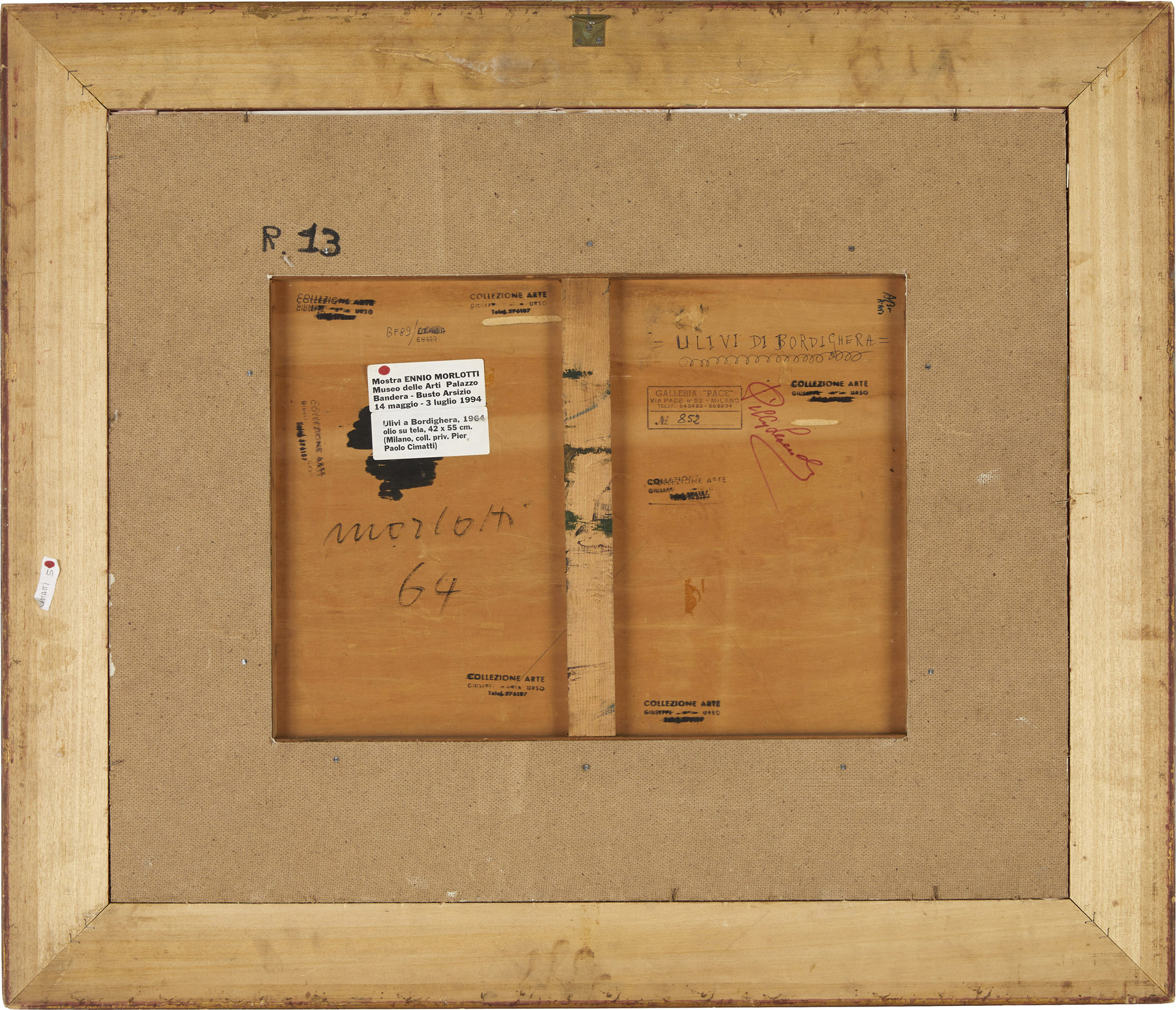 L'opera è stata visionata dall'Archivio Opere Ennio Morlotti in data 20 ottobre 2021 in quanto in "Ennio Morlotti, Catalogo Ragionato dei dipinti" Ed. Skira, Milano 2000, tomo I, p. 321, n. 813 è stata pubblicata come olio su tela invece trattasi di olio su tavola.