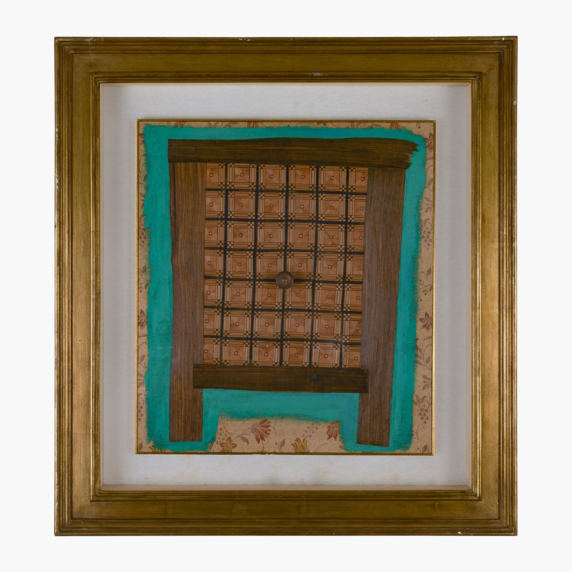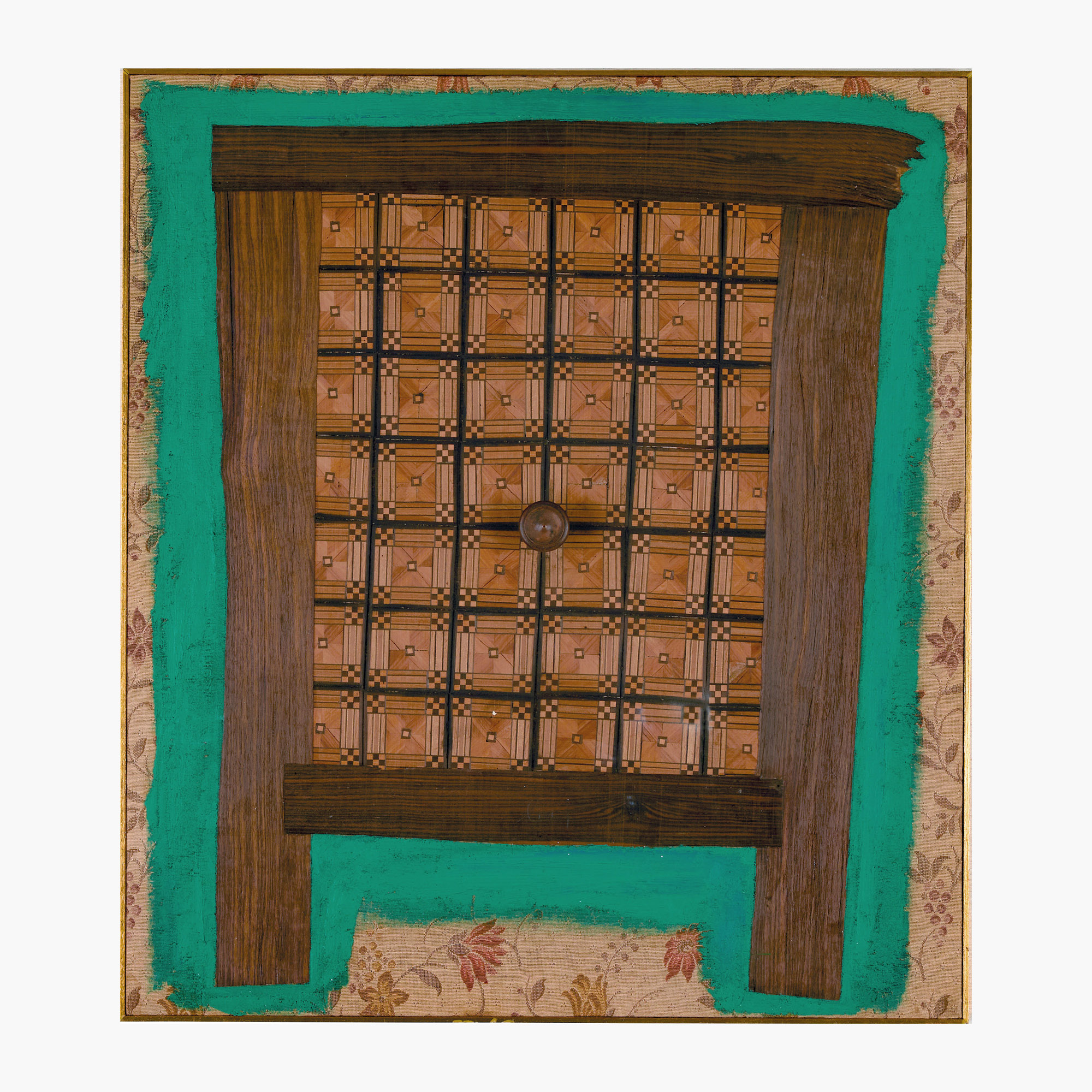 Olio, collage, intarsio, impiallacciatura, oggetto, stoffa su tavola