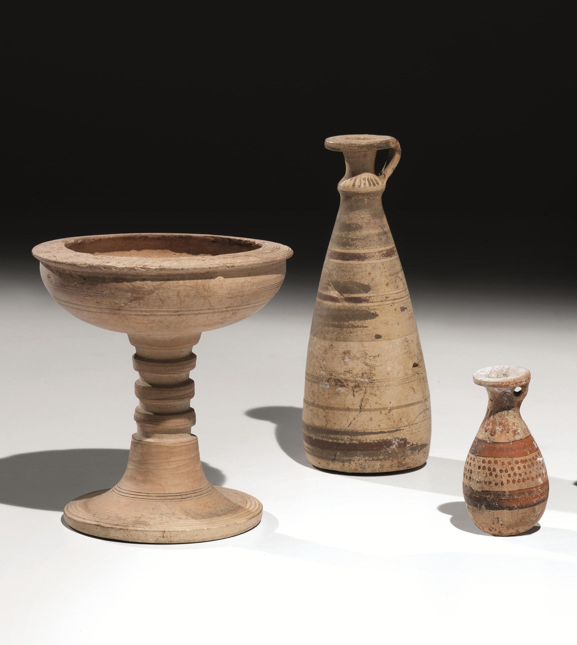 Aryballos piriforme con bocchello a disco, collo svasato, corpo piriforme, fondo convesso, piccola ansa a presa inserita fra il bocchello ed il collo, decorato sulla spalla con linguette verticali in paonazzo; sul corpo nel punto di massima espansione con alta fascia puntiforme fra due bande in bruno e paonazzo; alabastron a fondo piatto con bocchello a disco, collo cilindrico seguito da un rigonfiamento, corpo fusiforme rastremato verso l’alto; ansa a nastro impostata verticalmente; fondo piatto, decorato sul bocchello con cerchi concentrici; sul collo linguette radiali, sul corpo fasce orizzontali alternate in bruno e paonazzo, sull’ansa tratti orizzontali; calice su alto piede con labbro appiattito, vasca troncoconica a profilo convesso, alto stelo cilindrico, piede a tromba, decorato sulla vasca e sul piede da fasci di linee sottili e parallele, alternate a solcature profonde; sullo stelo quattro anelli intagliati (3)