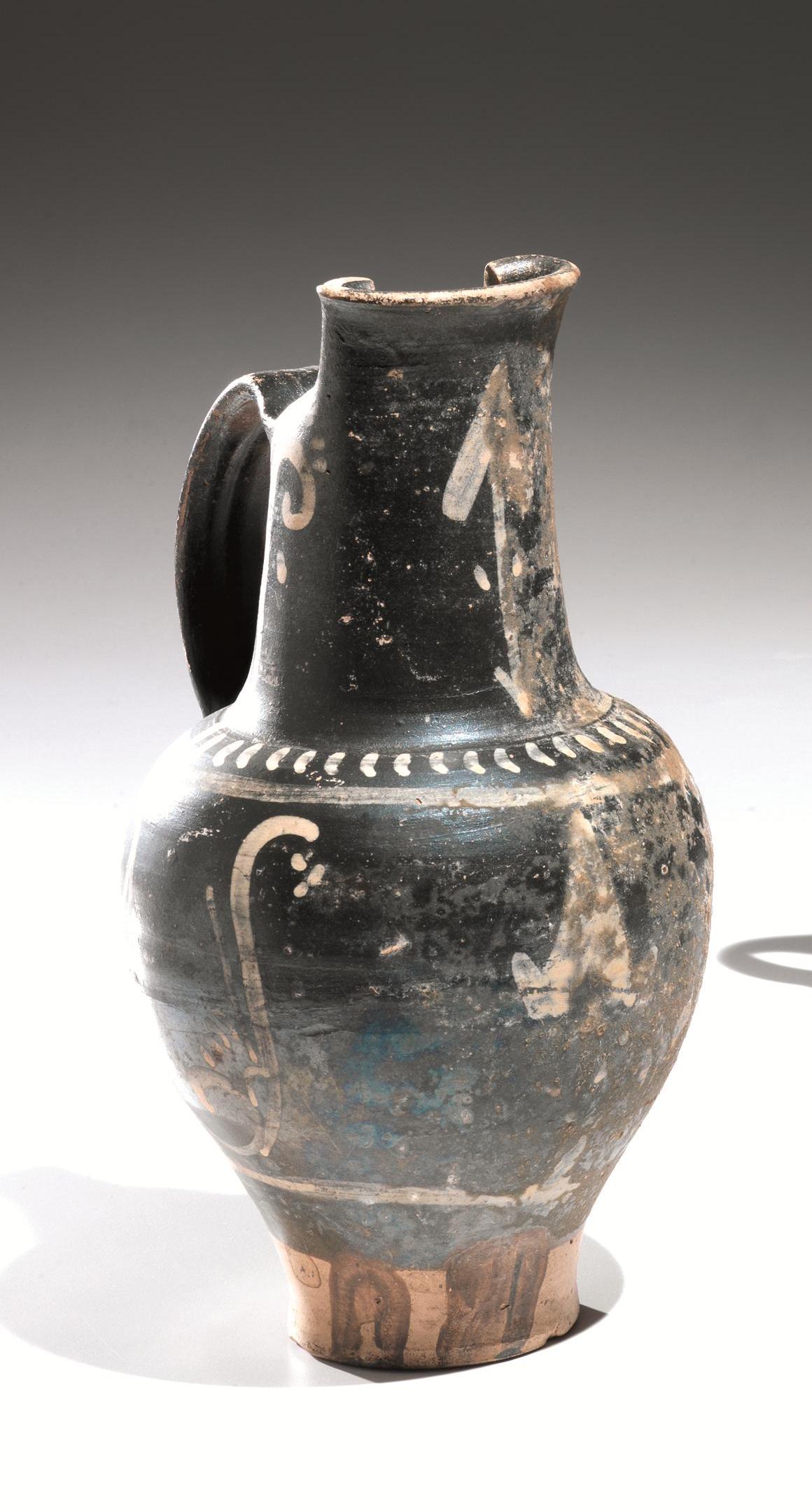 Oinochoe con bocca a cartoccio, collo troncoconico distinto dalla spalla; corpo ovoide allungato inferiormente, fondo piatto, ansa a nastro impostata verticalmente dall’orlo alla spalla decorata sul collo, sul ventre e sotto l’ansa motivo fitomorfo lanceolato tra girali vegetali, sulla spalla falsa baccellatura. Il resto del vaso, l’interno della bocca e l’ansa sono interamente verniciati, la parte inferiore del piede risparmiata; piccolo skyphos con labbro rettilineo e corpo troncoconico fortemente allungato verso il basso, piede troncoconico, anse a bastoncello impostate obliquamente sull’orlo, decorato in bianco con puntini e pampini stilizzati; due vasetti miniaturistici (4)